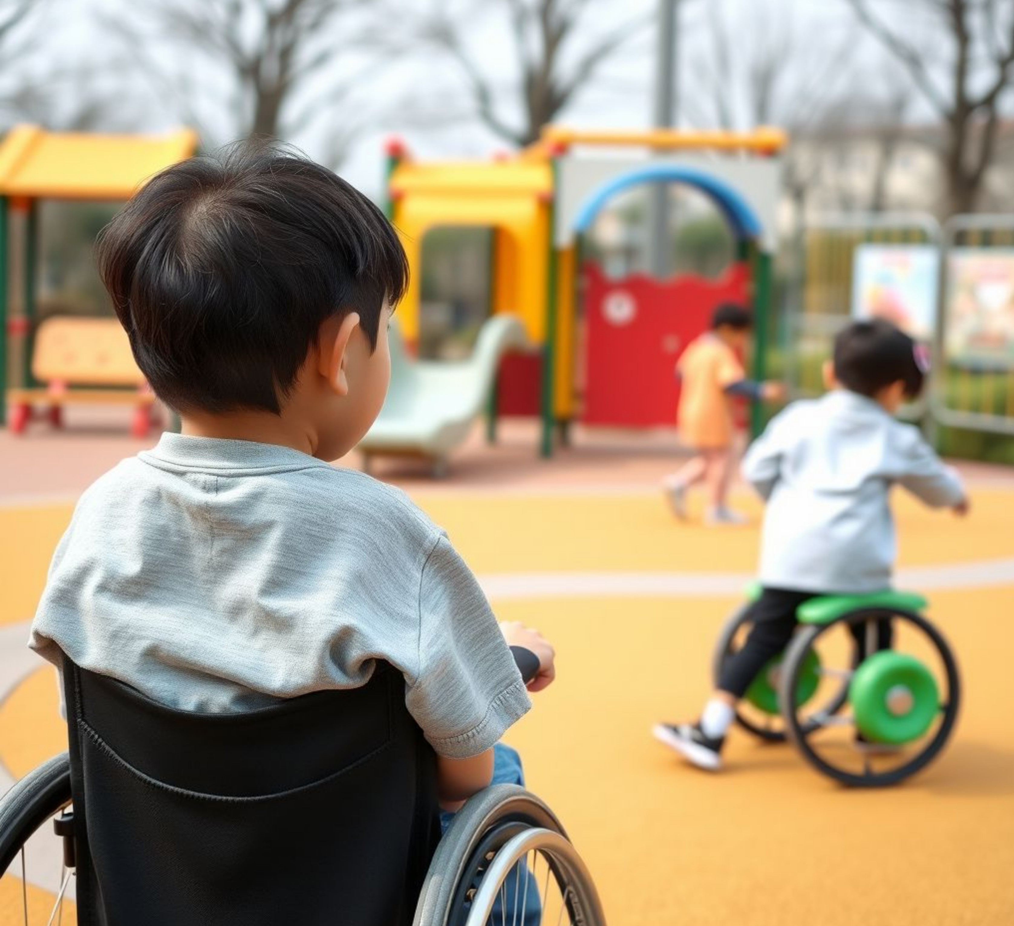 친구들은 신나게 그네를 타고 미끄럼틀을 오르내리지만, 아이는 그저 바라볼 수밖에 없습니다.