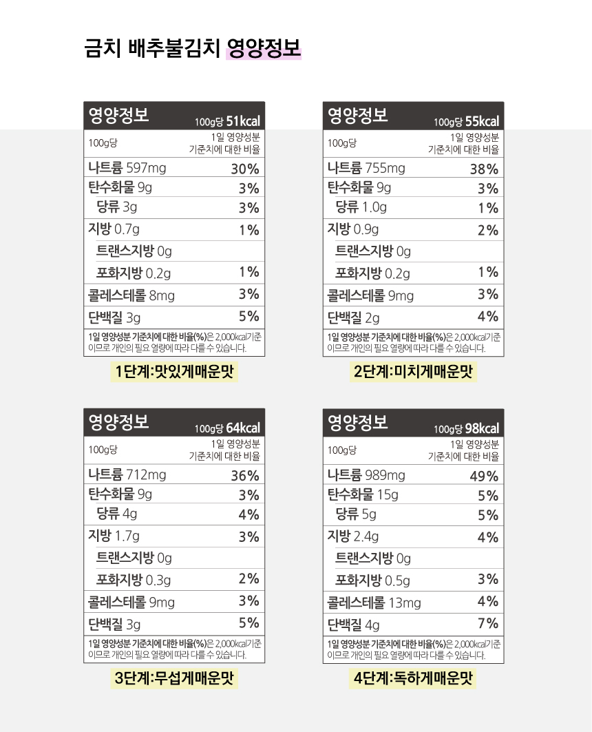| 제품명 | 배추불김치 1단계-맛있게매운맛/1.6kg, 2단계-미치게매운맛/1.6kg |