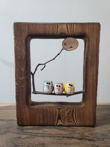 소나무원목에 고재느낌을 표현하고자 낙동기법으로 제작하여 모양이 각기 다른 나무가지위에 새와부엉이를 올려 인테리어용으로 뛰어난 공예문화상품이다.