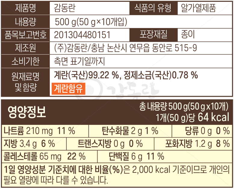 | 원재료명 (「농수산물의 원산지 표시 등에 관한 법률」에 따른 원산지 표시 포함) 및 함량(원재료 함량 표시대상 식품에 한함) | 계란(국산) 99.22%, 정제소금(국산) 0.78% |