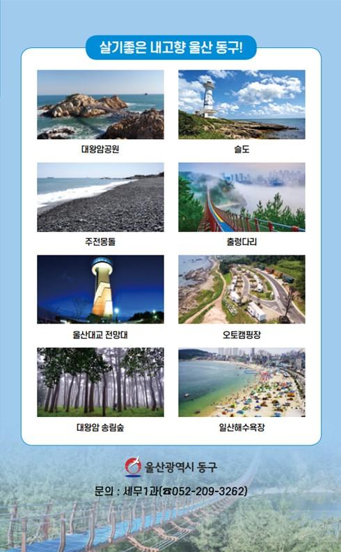 사람과 자연이 소리로써 만나는 소리의 풍경화, 울산 동구는 조선산업단지와 천혜의 자연 풍경이라는 두 가지 얼굴을 가지고 있습니다. 그 때문에 동구는 가장 아름다운 아홉 가지 소리를 소리 9경으로 지정하여 인간 삶의 소리와 자연이 자아내는 소리의 아름다움과 그 조화를 보여주려고 노력해왔습니다. 동구에서 자연의 아름다움을 느끼고 싶다면 대왕암공원과 일산해수욕장을, 사람의 삶과 역사를 느끼려면 울산의 지정문화재와 야경으로 유명한 전망대를 방문할 수 있습니다. 동구 자연과 인간 삶의 조화를 대표하는 소리 체험관은 이 지역에서만 찾을 수 있는 명소입니다. 또한 동구의 특산품인 용가자미를 맛볼 수 있는 방어진항 근처의 어시장에 들르면, 우리나라에서 가장 신선하고 맛있는 가자미를 즐길 수 있을 것입니다.