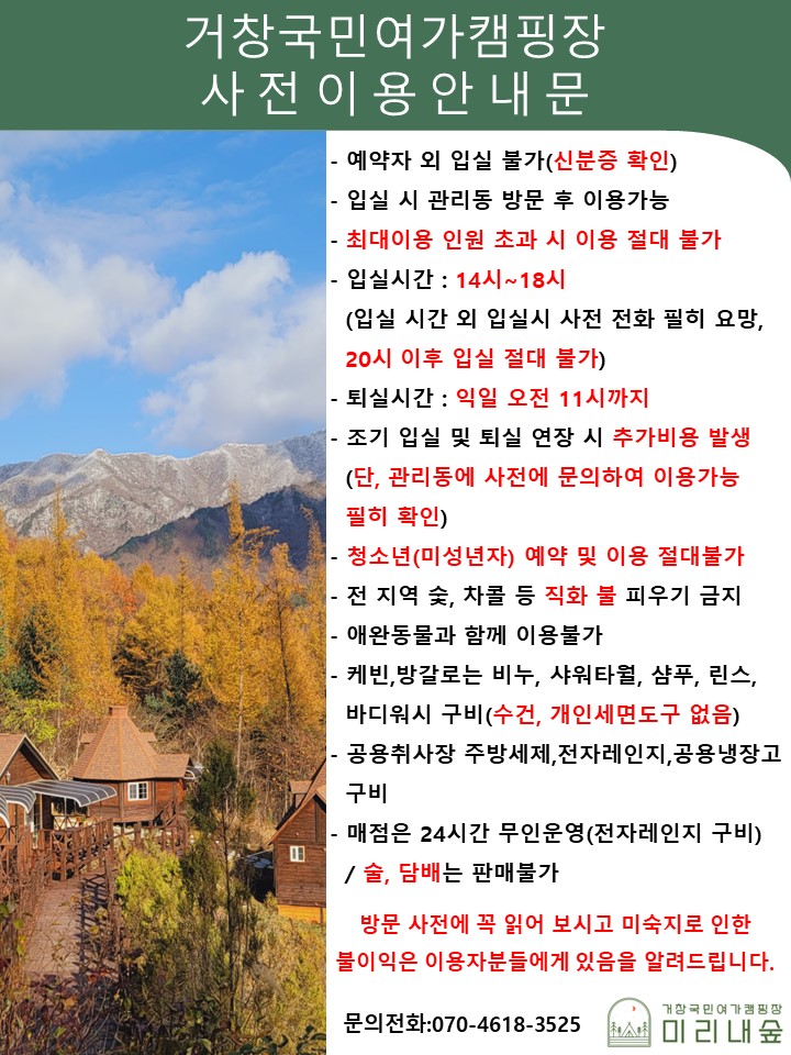 ※ 객실 상세정보는 미리내숲 홈페이지(거창국민여가캠핑장 미리내숲)를 통해 확인하실수있습니다.