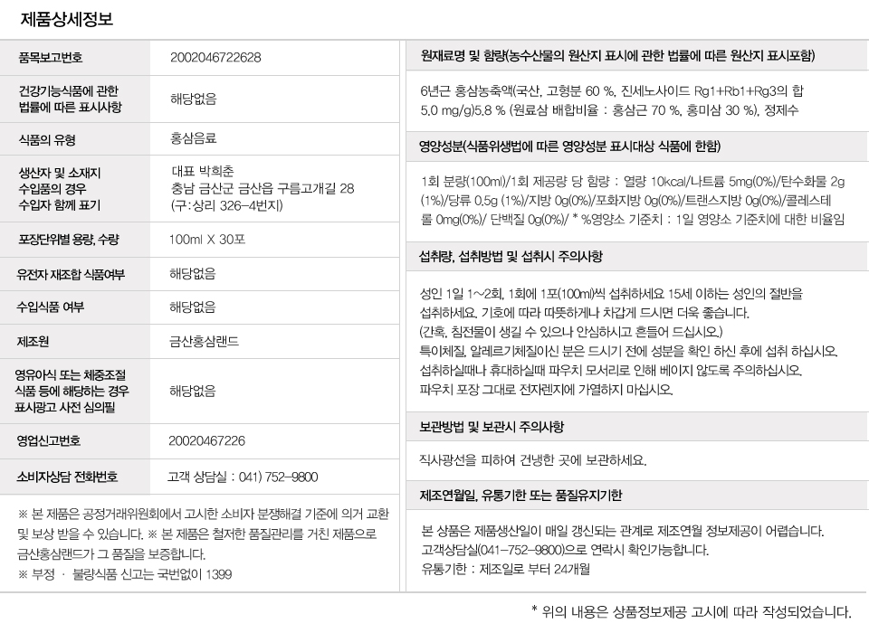 | 원료명 및 함량 (「농수산물의 원산지 표시 등에 관한 법률」에 따른 원산지 표시 포함) | 상세정보 별도표기 |