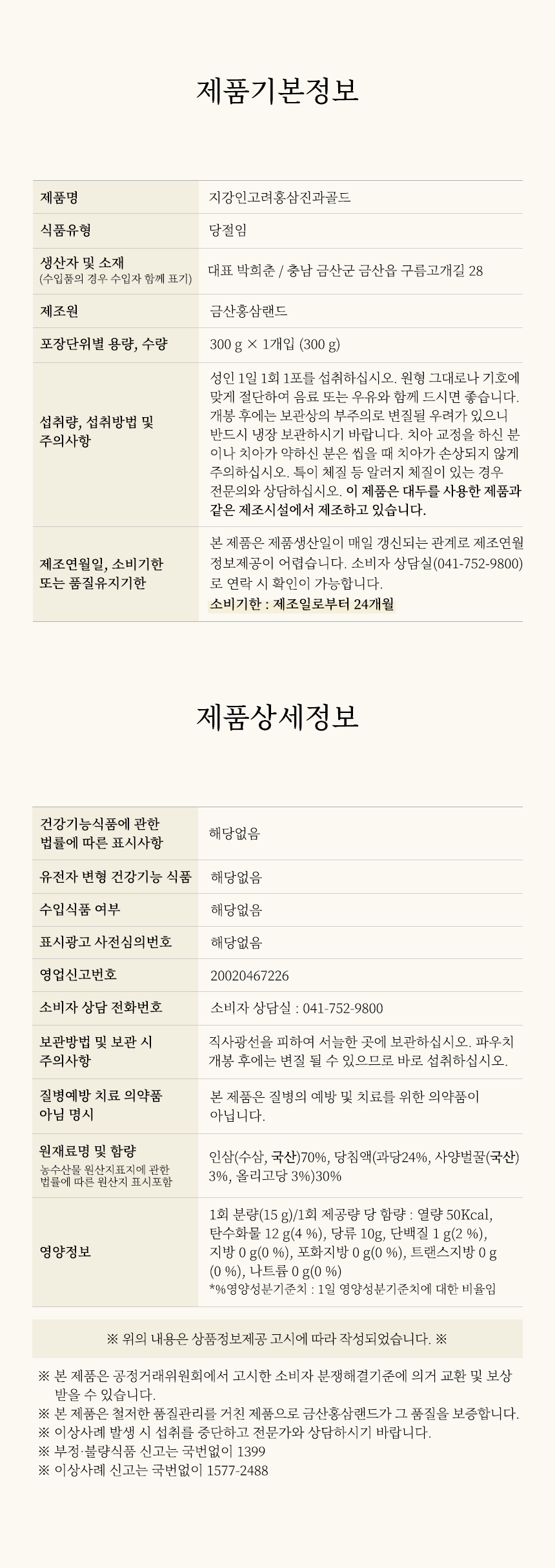 | 원료명 및 함량 (「농수산물의 원산지 표시 등에 관한 법률」에 따른 원산지 표시 포함) | 상세정보 별도표기 |