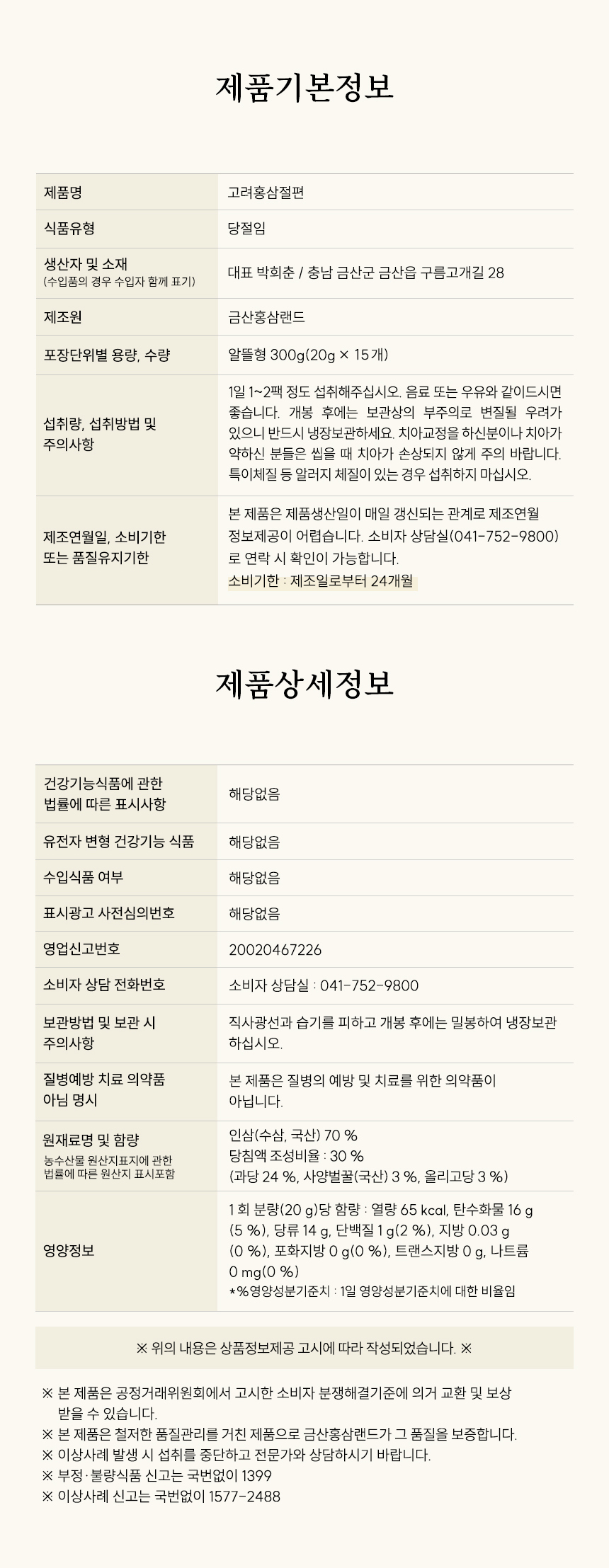 | 생산자 및 소재지(수입품의 경우 생산자, 수입자 및 제조국) | 금산홍삼랜드 |