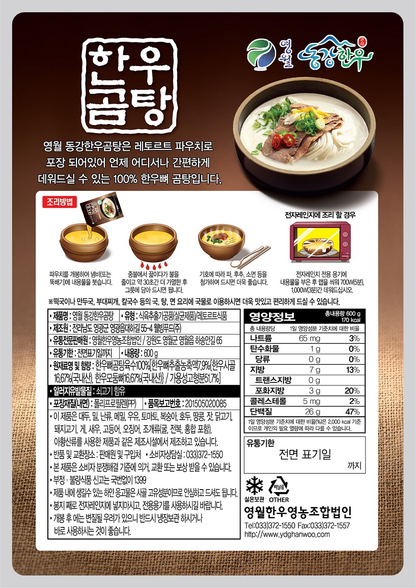 | 식품의 유형 | 영월동강한우 곰탕 가공품 |