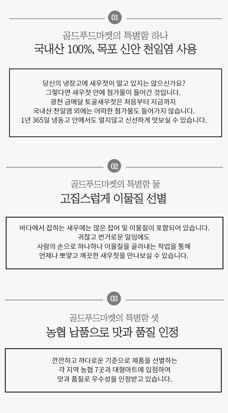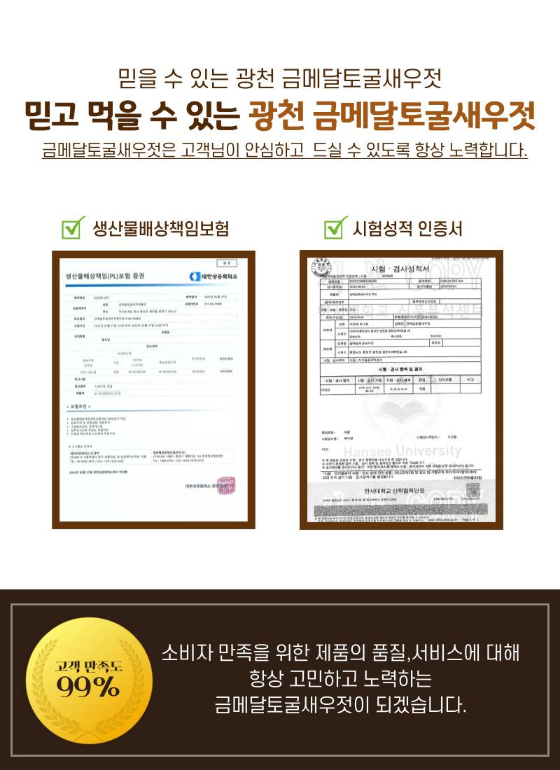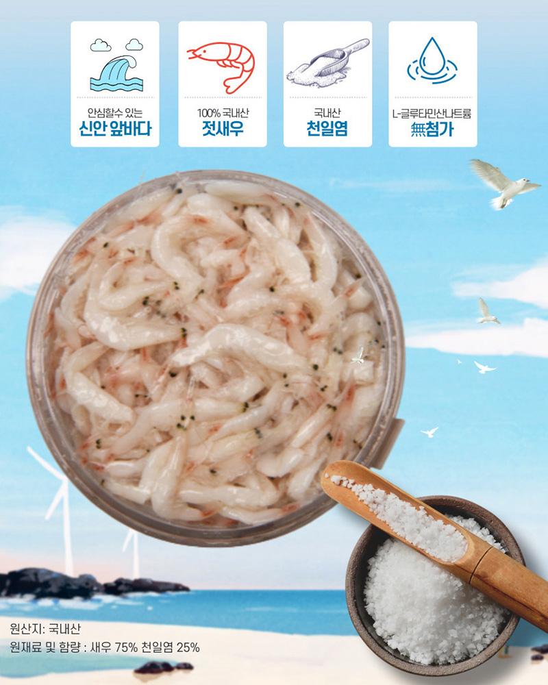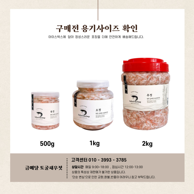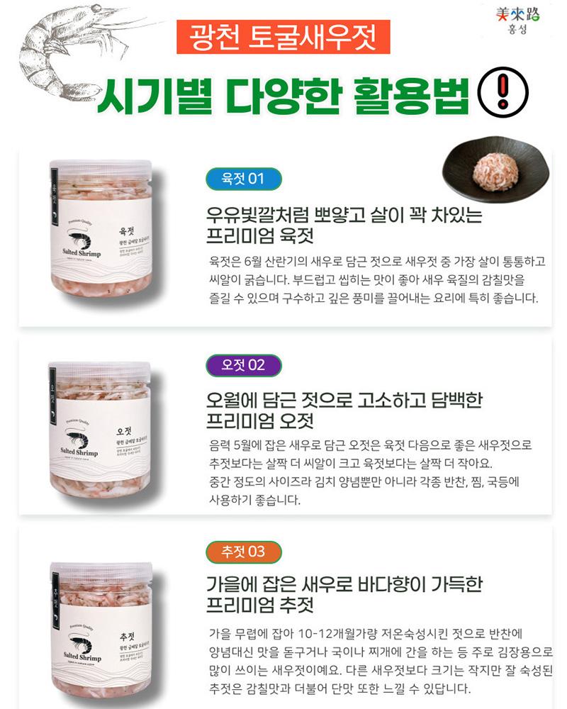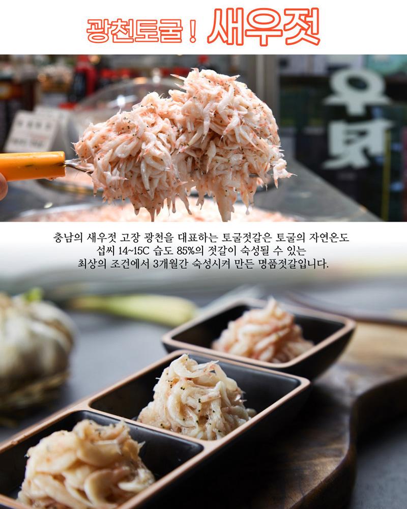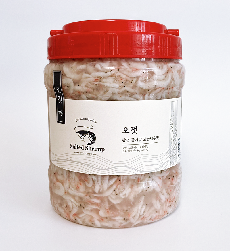 PREMIUM SALTED SHIRIMP 토굴에서 숙성한 프리미엄 오젓 오젓은 5월에 잡은 새우로 담근 젓으로 육젓보다는 조금 작으나감칠맛은 가장 으뜸이라서 각종 찌개, 나물 등에 양념으로 많이 쓰여요.씹히는 맛이 육젓 못지 않게 뛰어나며 색이 뽀얗고 하얀것이 특징입니다.광천금메달토구새우젓은 토굴 새우젓의 원조 "충남 광천읍"에 위치하며1년 365일 일정한 온도를 유지하는 토굴에서 발효와 숙성을 거쳐 완성합니다.※원재료 및 함량 : 국내산 새우 75%, 국내산 천일염 25%