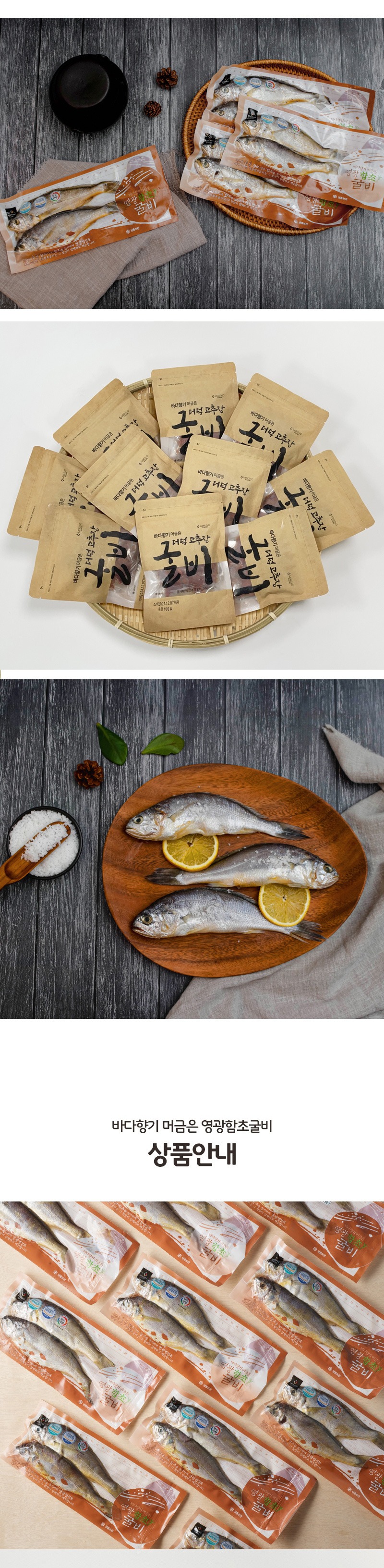 | 원산지 | 함초굴비 : 참조기(국산), 천일염(국산), 함초분말(국산) 더덕고추장굴비 : 굴비(국산), 고추장(국내산), 더덕분말(국산), 양념(국내산) |