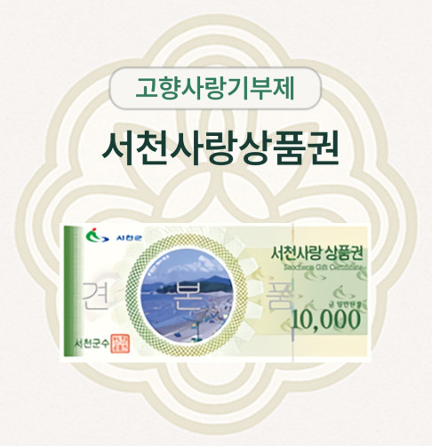 서천군에 놀러 오셔서 「 서천사랑 상품권」과 함께 우리 농수축산품, 내 고장 기업제품, 지역상점 및 재래시장을 이용하여 고향사랑, 기업사랑의 마음을 실천하는 즐거움을 느껴 보시기 바랍니다.