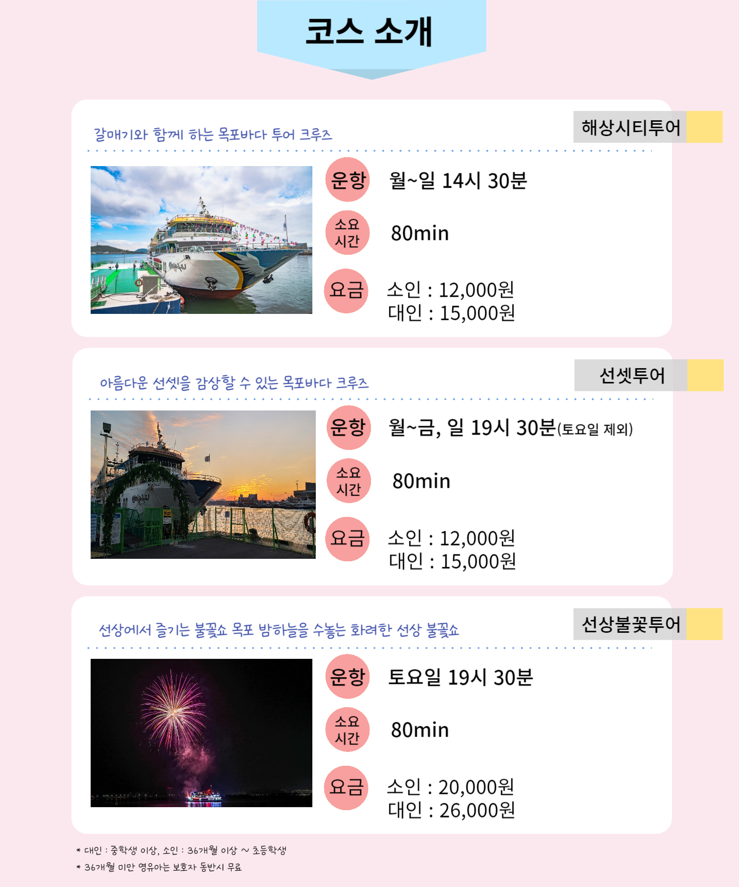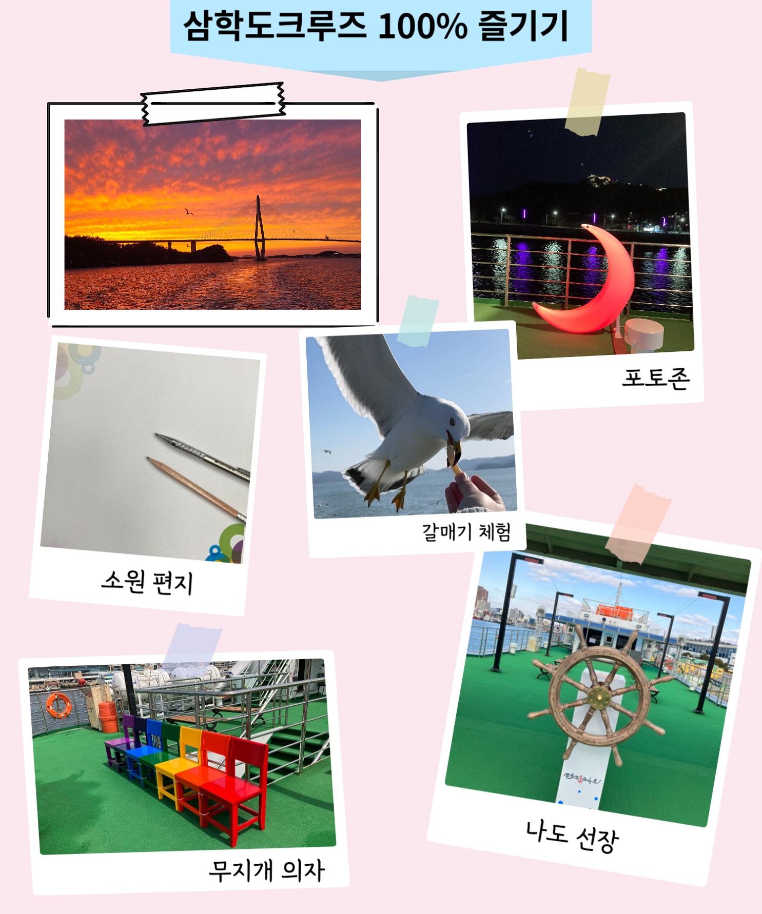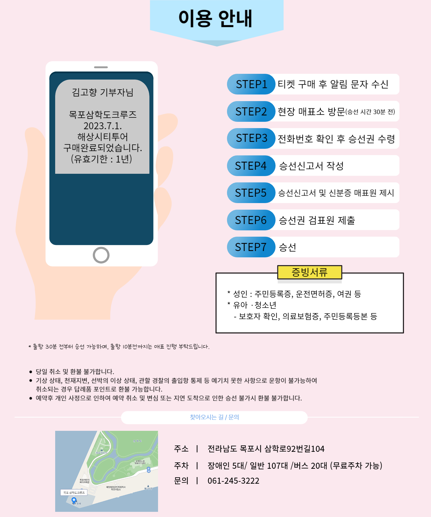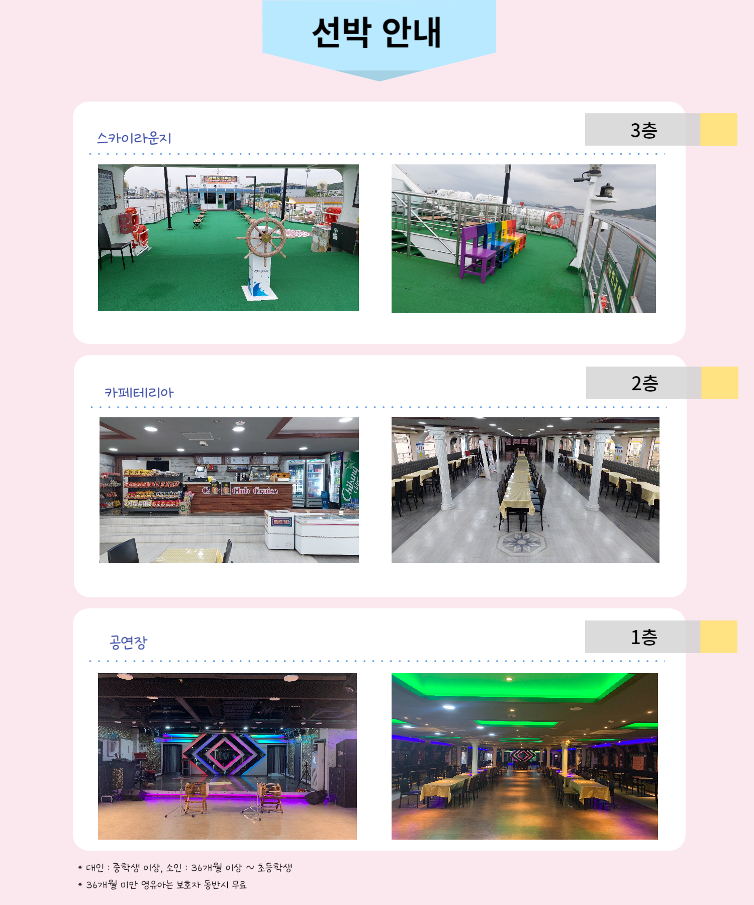 - 크루즈 투어 중 뛰거나 다른 승선 고객에게 위배되는 행위는 삼가 해주세요.