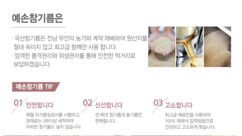 | 식품의 유형 | 유지류(참기름, 들기름, 볶음참깨) |