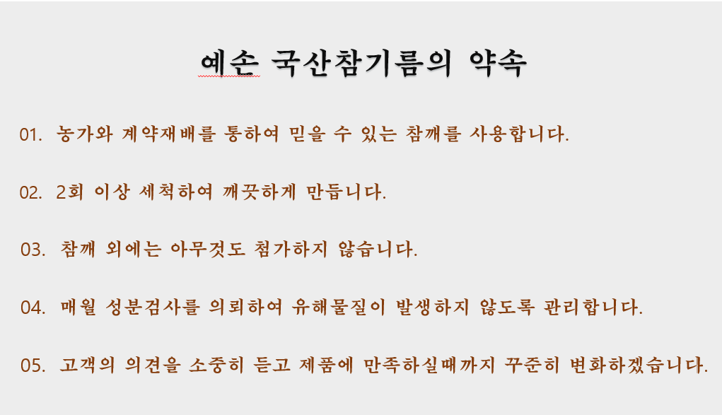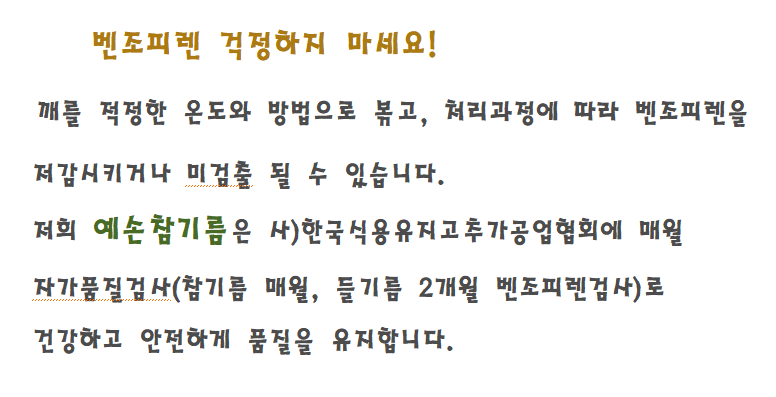 | 원재료명 및 함량 | 국내산 참깨 100%, 국내산 들깨 100% |