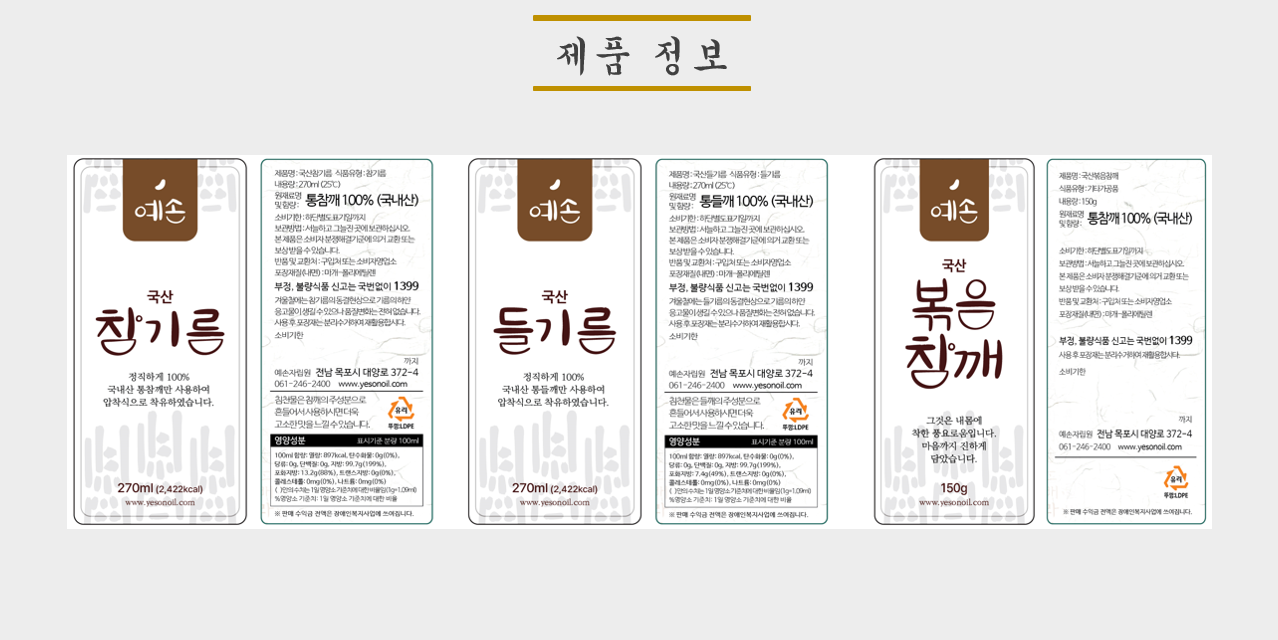 | 포장단위별 내용물의 용량(중량), 수량 | 참기름 1병(270ml) , 들기름 1병(270ml), 볶음참깨 1병(150g) |
