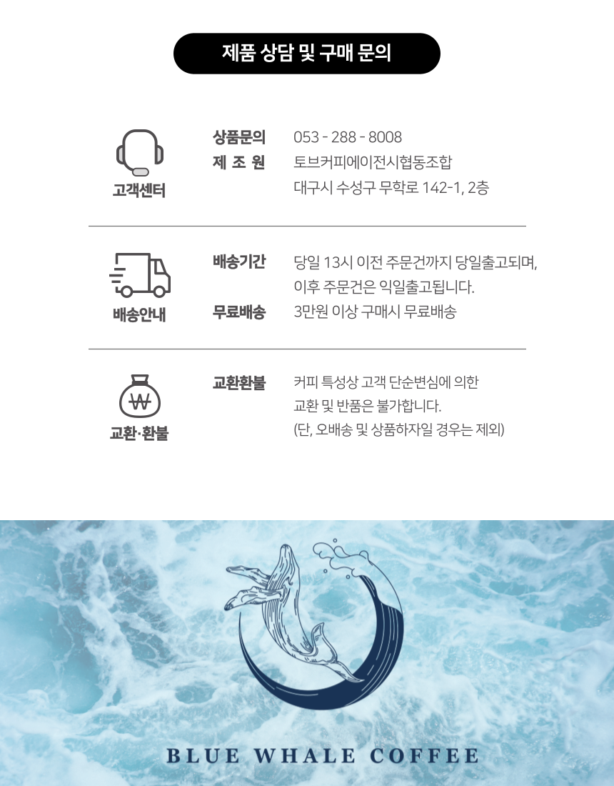 | 생산자 및 소재지 | 토브커피에이전시협동조합 대구광역시 남구 앞산순환로 75길 45-1, 3층 |