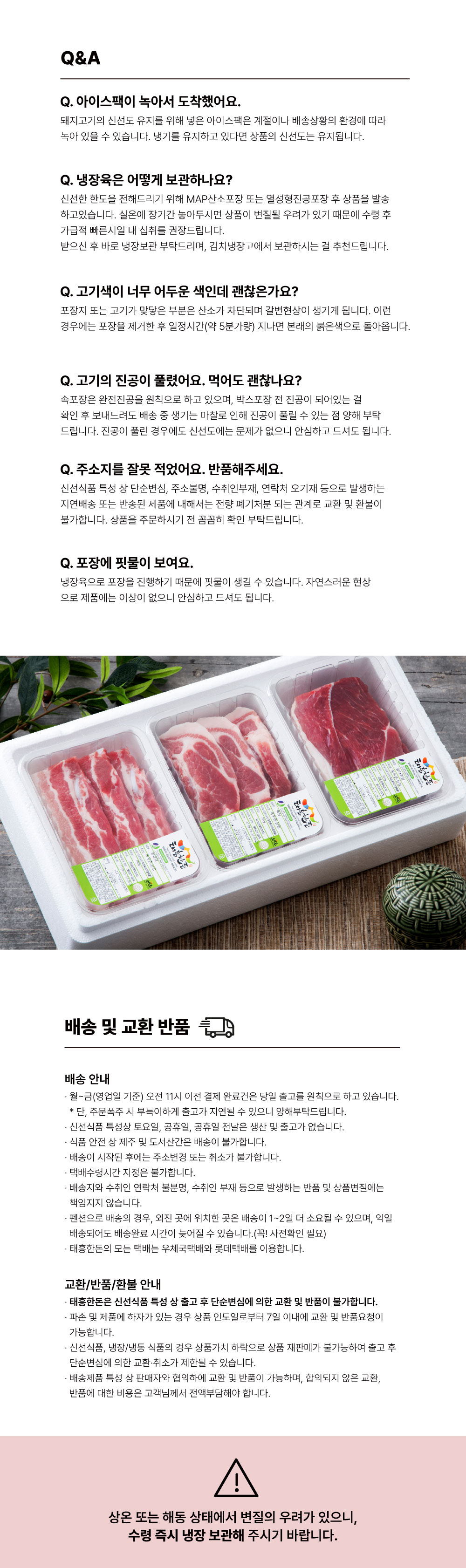 | 세부 품목군별 표시사항 | 배송되는 축산물 상품에는 이력번호가 표시되어 있습니다. 국내산 축산물은 www.mtrace.go.kr 에서 조회 가능 하며, 수입산 축산물은 www.meatwatch.go.kr에서 조회가능합니다. |