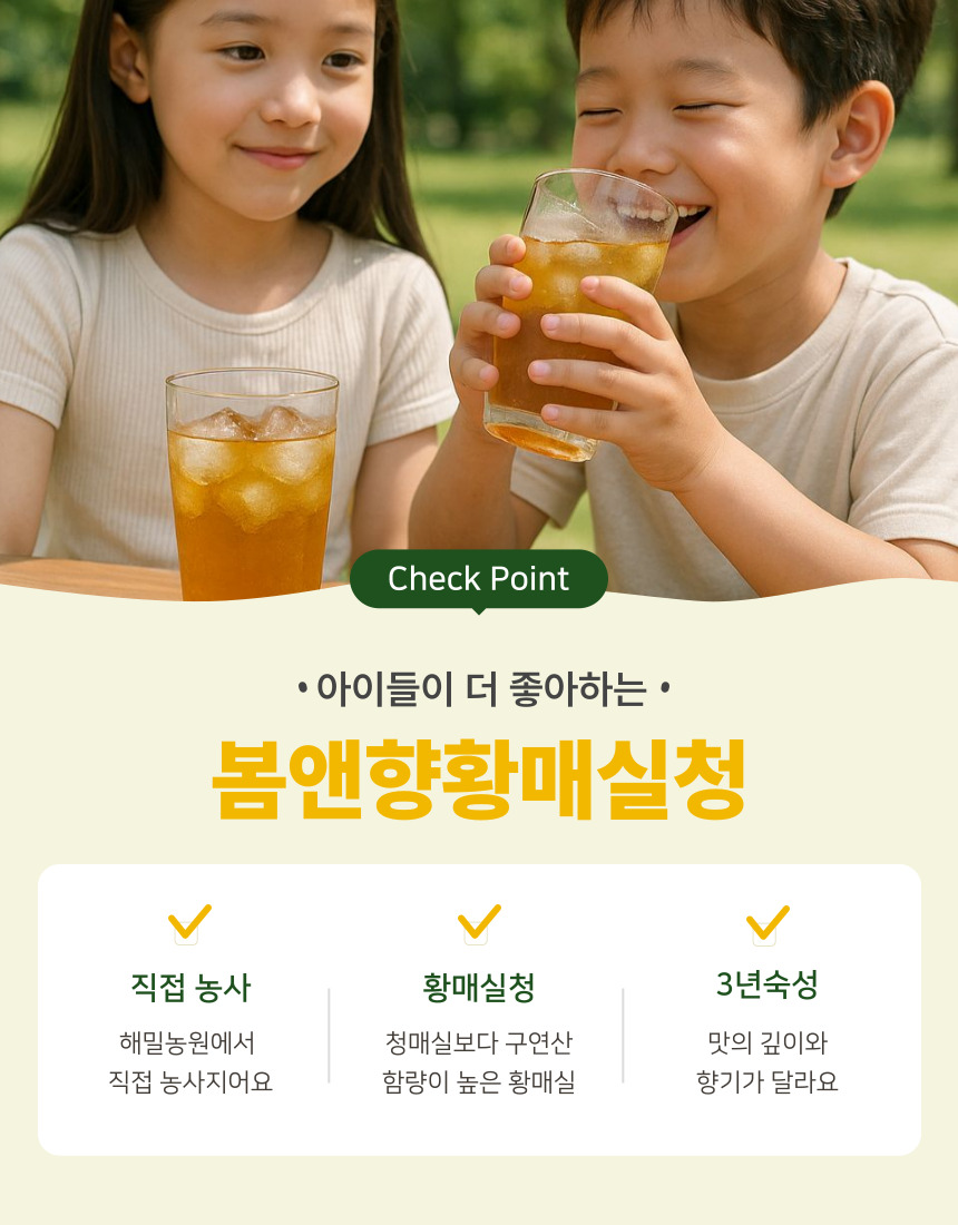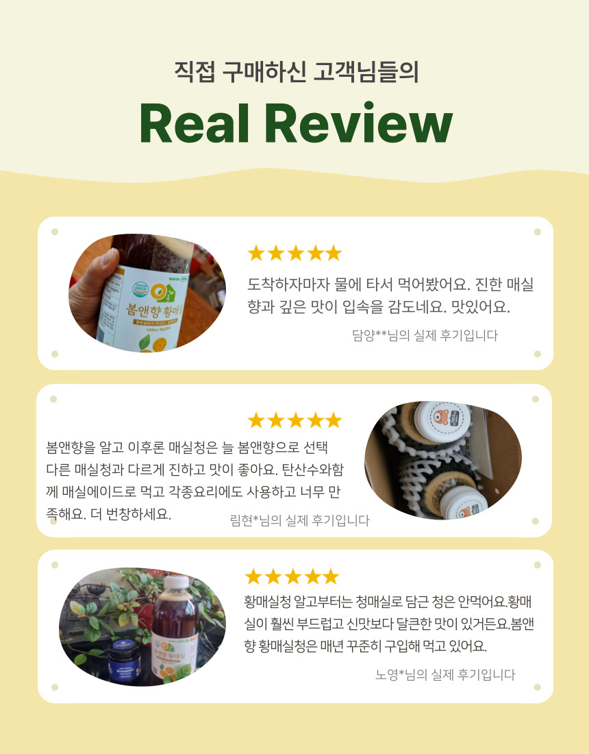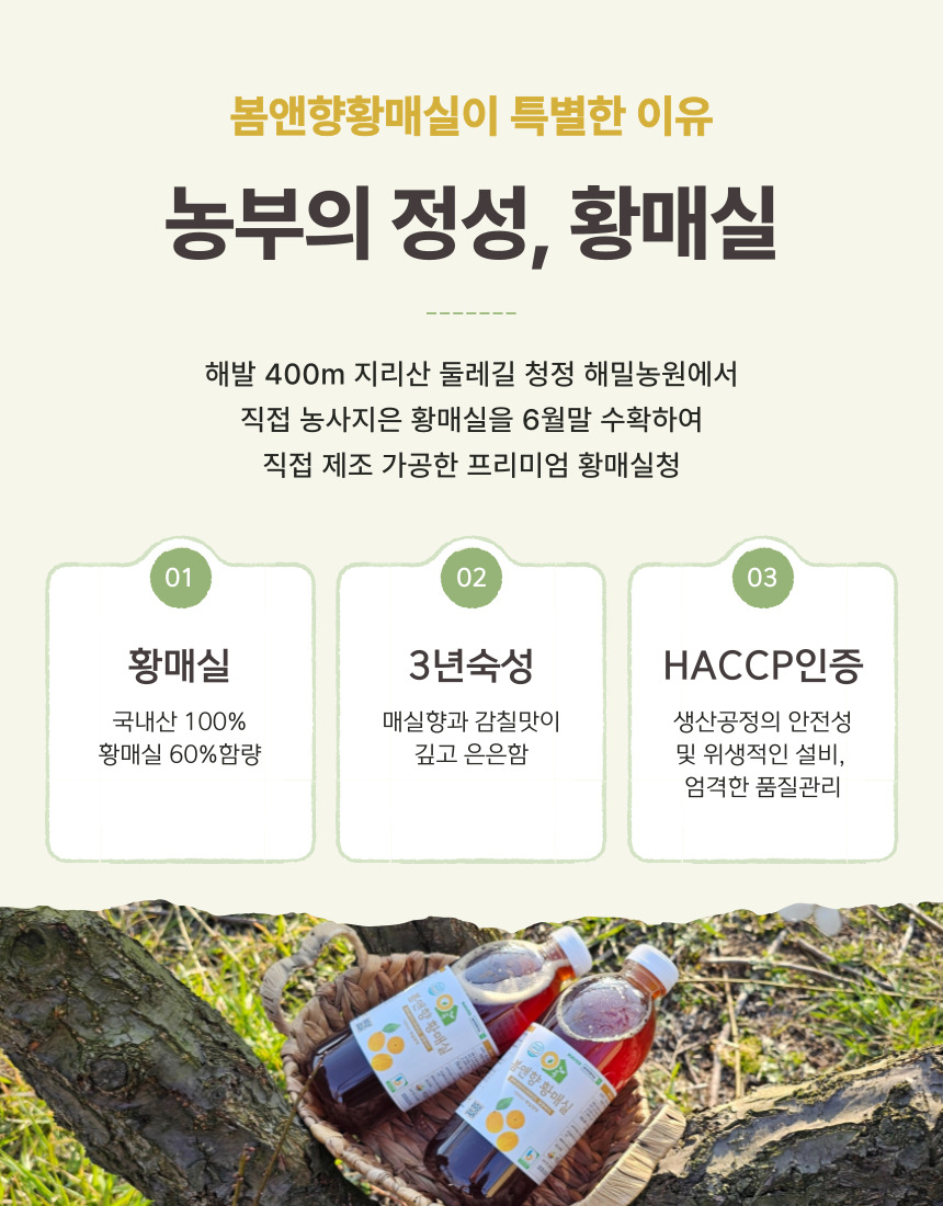 | 소비자 안전을 위한 주의사항 | 1. 본 제품은 농축된 황매실 원액으로, 권장 희석 비율 (물 또는 탄산수 1:4~1:5) 또는 기호에 따라 희석하여 음용하십시오. 2. 직사광선을 피해 서늘하고 건조한 곳에 보관하십시오. 3. 침전물이 생길 수 있으나, 이는 황매실의 천연 성분이므로 안심하고 흔들어 드십시오. 4. 당알코올, 인공감미료, 보존료를 첨가하지 않았으며, 원물의 당류가 농축되어 당뇨 등 건강에 민감하신 분은 섭취 전 전문가와 상담하십시오. 5. 어린이, 임산부, 특이 체질 |