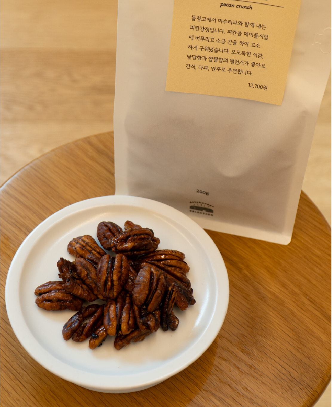 1. 피칸 강정 200g돌창고 카페의 디저트 메뉴, '미수티라'의 토핑으로 올라가는 피칸 강정입니다.
