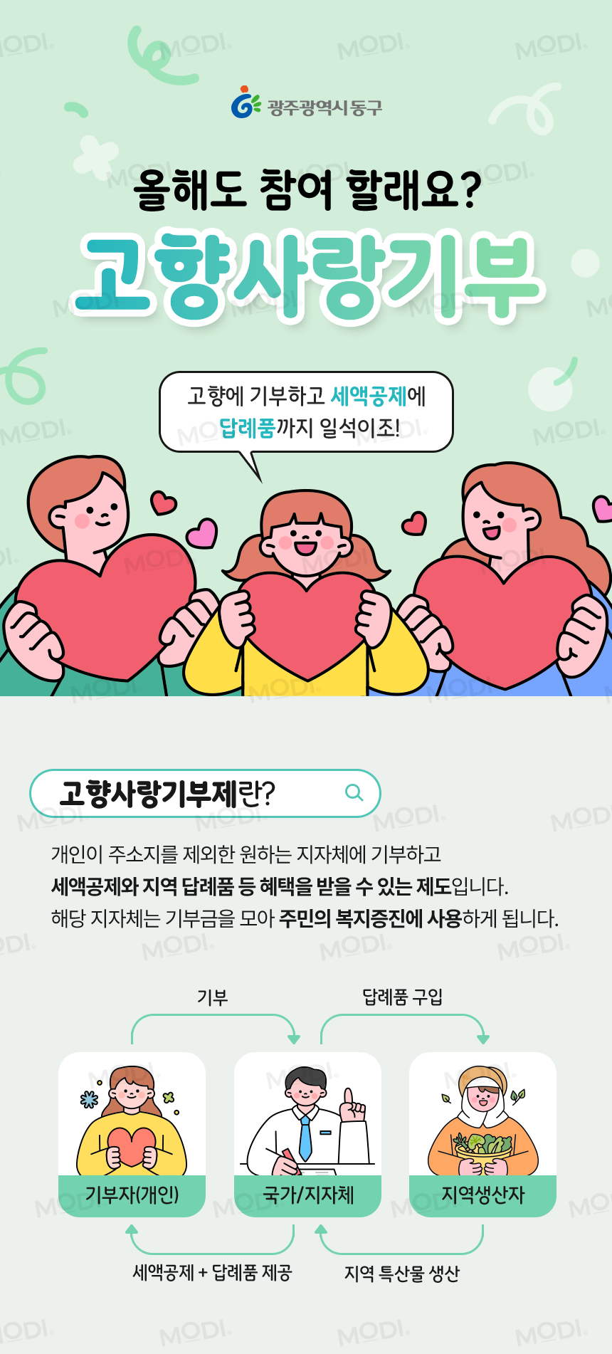광주광역시 동구는 광주의 심장이자 문화예술의 중심지로서 역사와 문화예술이 살아 숨쉬는 지역입니다. 청년들의 열기로 가득한 충장로,광주의 경제가 움직이는 금남로를 중심으로 광주 지역민들의 자부심이 되고자 지역경제 활성화에 힘쓰고 있습니다. 광주 동구는 '이웃'을 핵심 가치로 삼고 이웃 모두가 더불어 살아갈 수 있는 마을, 서로의 어려움을 보듬고 함께 이겨낼 수 있는 마을, 그리하여 '이웃을 함께 돌보는 마을'로 거듭나기 위해 고향사랑기부제로 시민들의 행복한 삶에 힘을 보태고자 합니다.