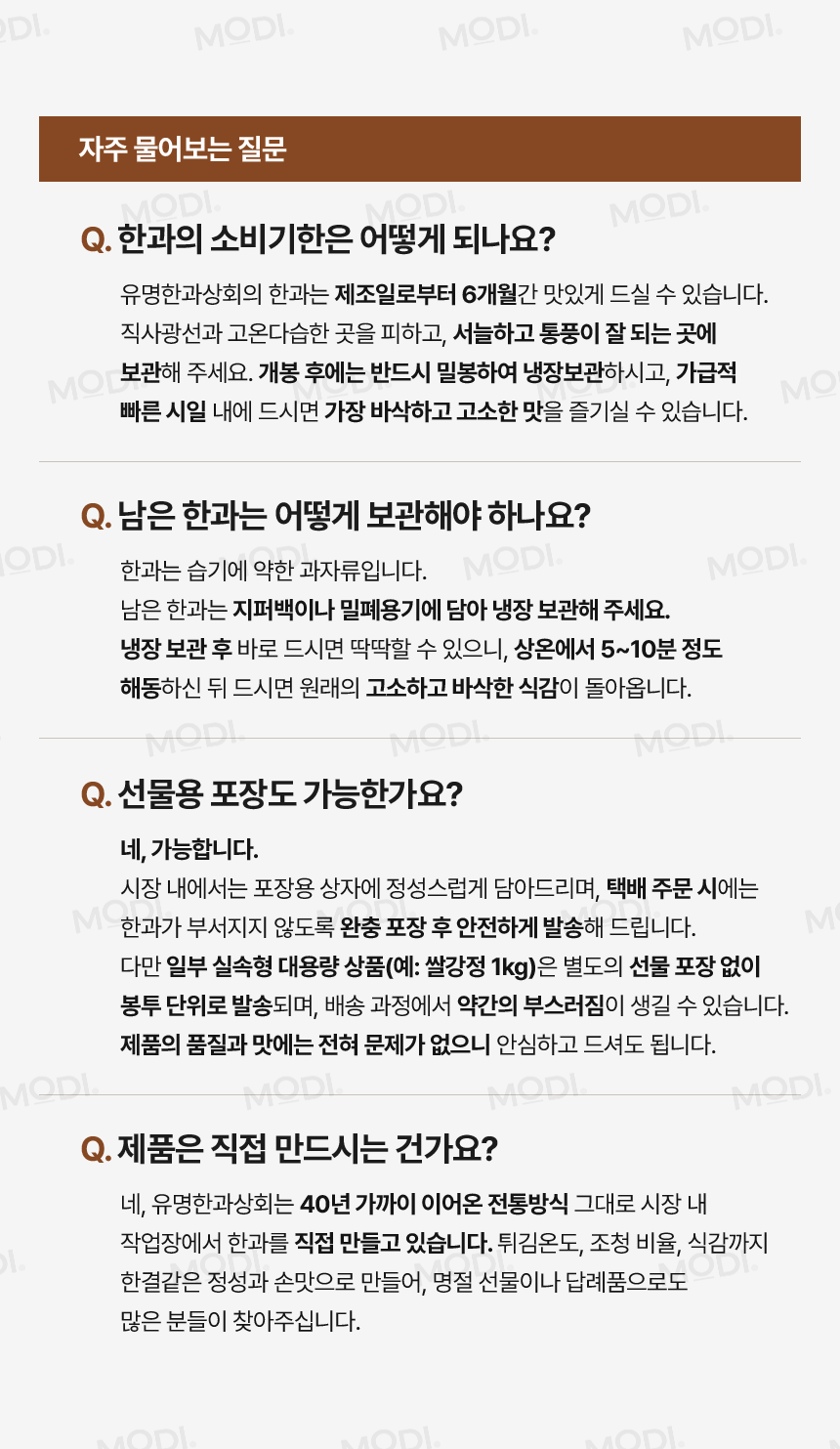 | 포장단위별 내용물의 용량(중량), 수량 | 유과 150g, 쌀강정250g,들깨강정300g,약과600g |