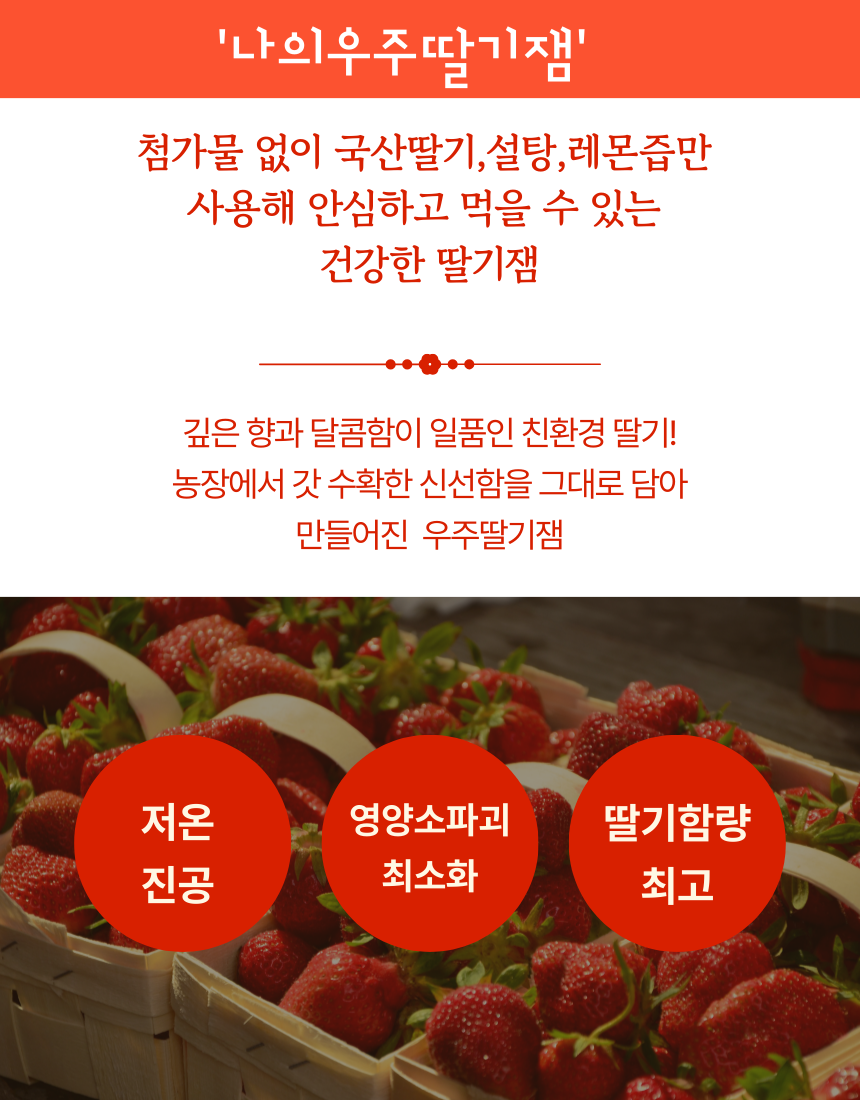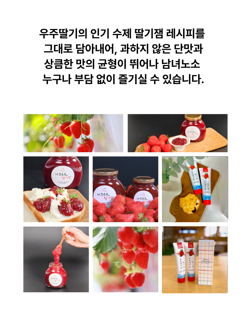 | 원재료명 및 함량 | 나의우주,딸기잼 : 딸기 80%, 설탕 19%, 레몬즙 / 우주에서온딸기잼 : 딸기82%, 설탕16%, 레몬즙 |