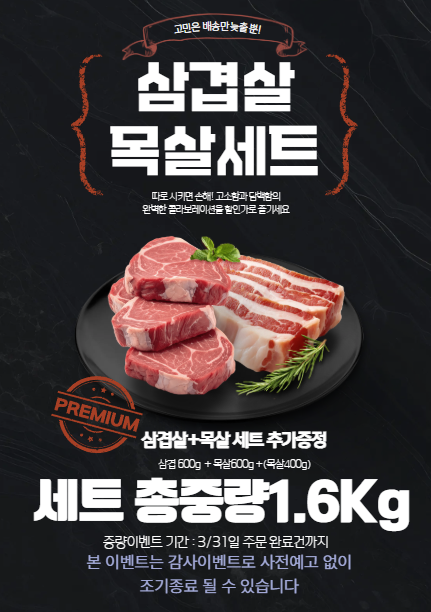 [이벤트]국내산 목살삽겹세트 1.6kg(삼겹 600g+목살 600g)+목살400g