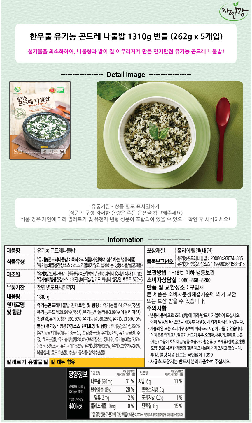 | 포장단위별 내용물의 용량(중량), 수량 | 통새우볶음밥 300g*7 / 유기농 곤드레나물밥 262g*5 |