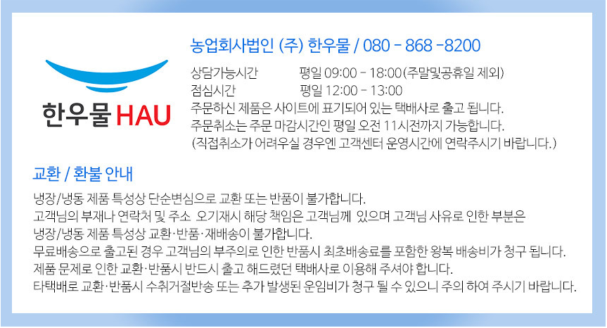 | 소비자상담 관련 전화번호 | 한우물 080-868-8200 |