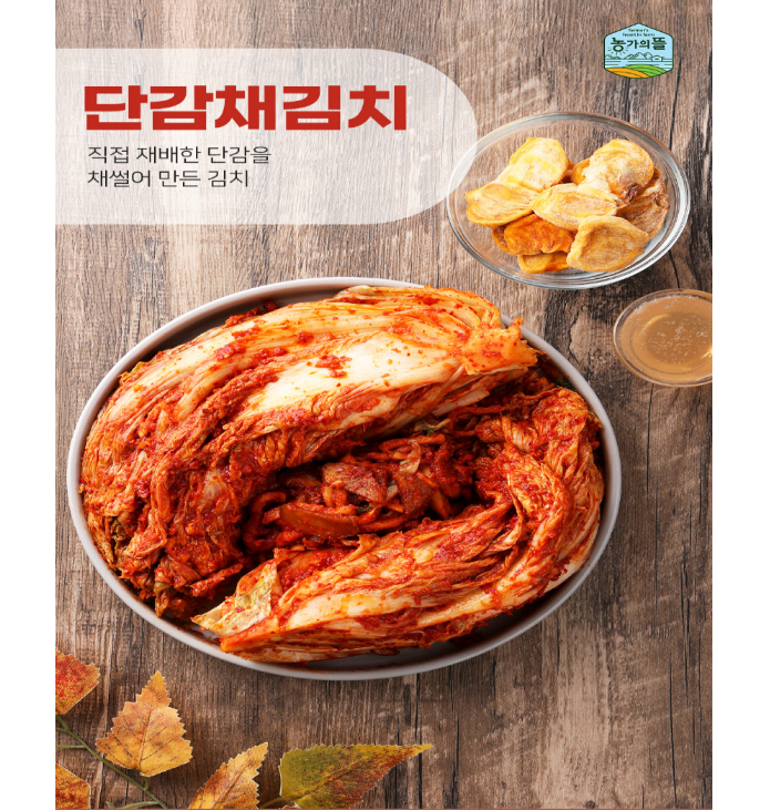 | 원재료명 및 함량 | 절임배추72%, 무9.5%, 고춧가루 4.5%, 마늘3%, 단감채3.5%, 단감즙1.5%, 새우젓2%, 멸치액젓1.9%, 생강0.7%, 정제염0.4%, 팽화미1% |