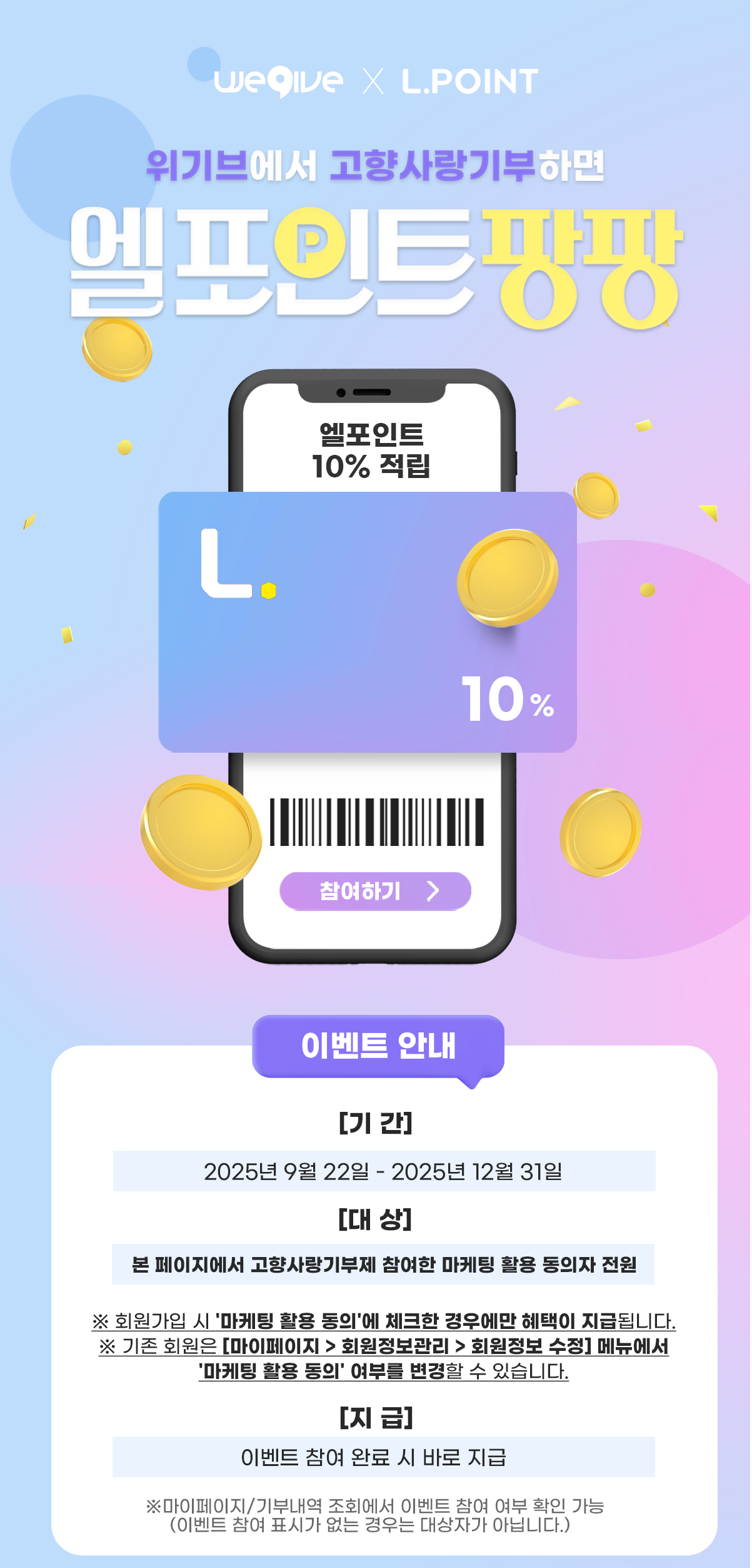 이벤트 기간(9/25~12/31) 동안, '위기브'의 엘포인트 이벤트 페이지를 통해 10만원 이상 고향사랑기부제에 참여한 모든 분들께, 기존 고향사랑기부제 혜택에 더해 기부액의 10%를 엘포인트로 추가 적립해 드립니다.