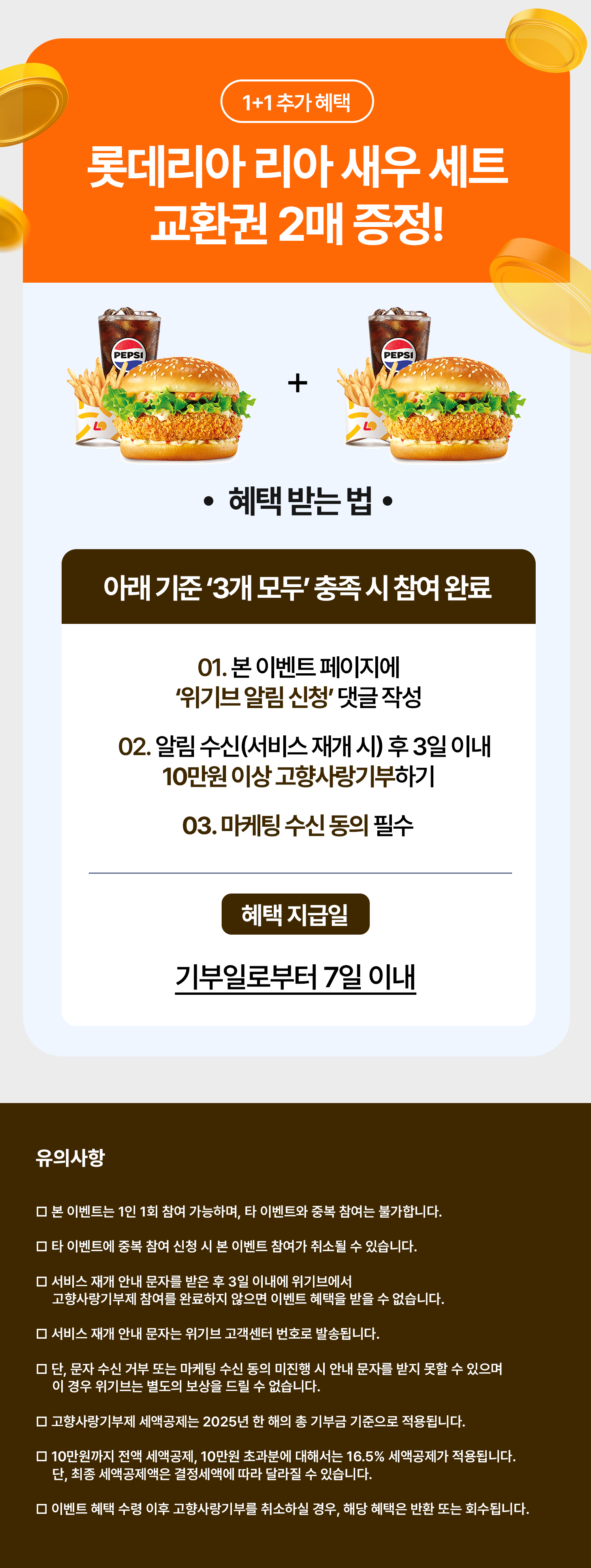 더 나아가 이번 위기브 X 롯데리아 사전 예약 이벤트에 참여하시면, 롯데리아 리아 새우 세트 교환권 2매까지 보너스로 받을 수 있으니 이보다 더 실속 있는 기부는 없다고 봐야겠죠.