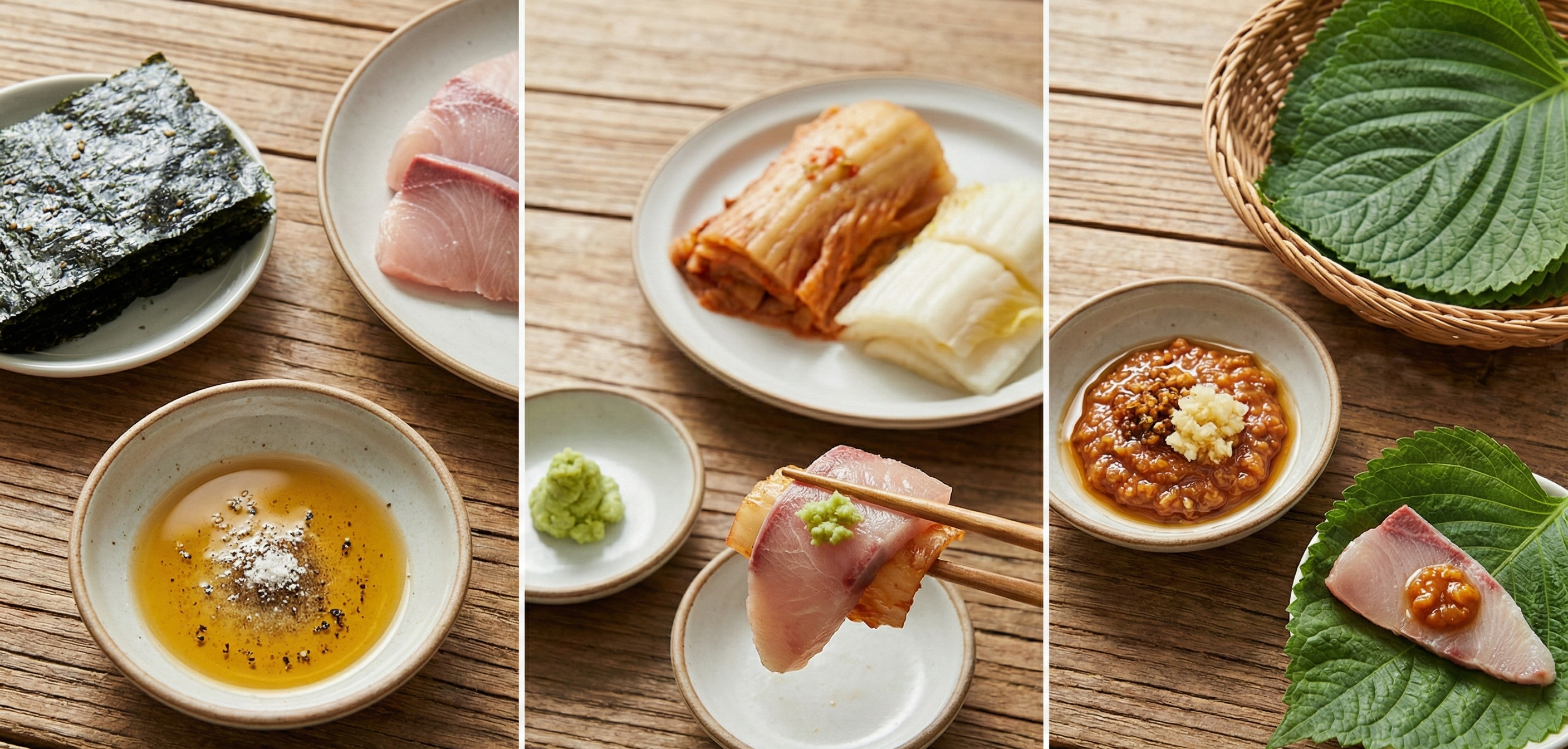 클래식의 정석: 기름장 + 김 고소한 방어에 고소한 참기름을 더해 풍미를 극대화하고, 조미김의 짭조름함으로 밸런스를 맞춥니다. 가장 호불호 없는 조합입니다.