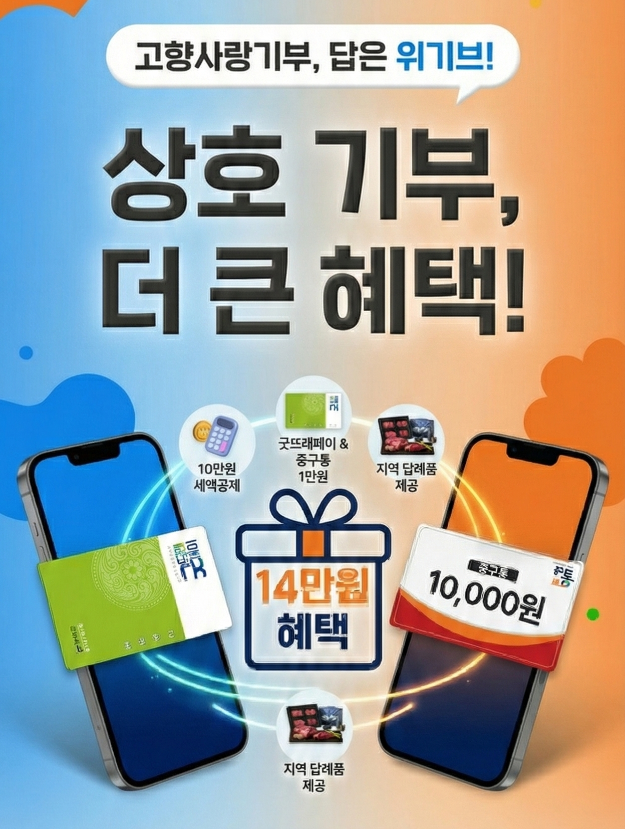 10만 원을 기부하면 기존 혜택에 더해 '지역화폐 1만 원'을 추가로 얹어줘, 무려 총 14만 원 상당의 혜택을 돌려받는 파격적인 조건입니다.