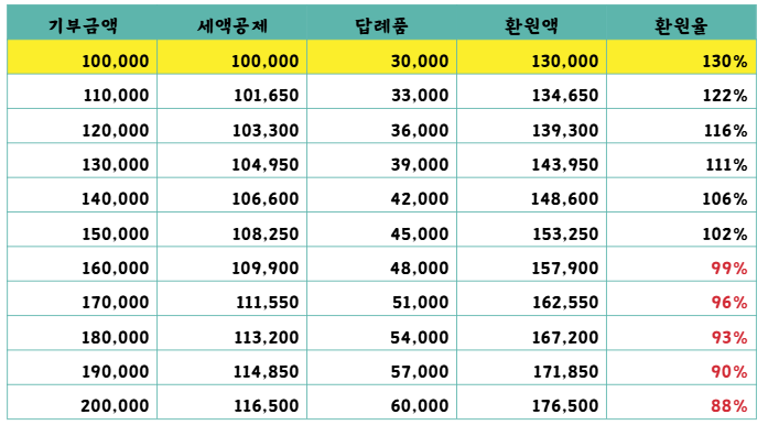 2. 하지만, 여전히 가장 수익률이 높은 구간은 '10만원'(10만원 기부 ↔ 10만원 세액공제 + 3만원 답례품)