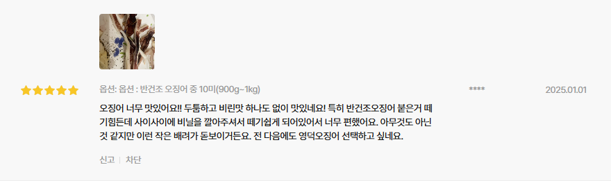 "존맛이에요 반건조 오징어 이렇게 부드럽고 쫀득한건 처음이네요"