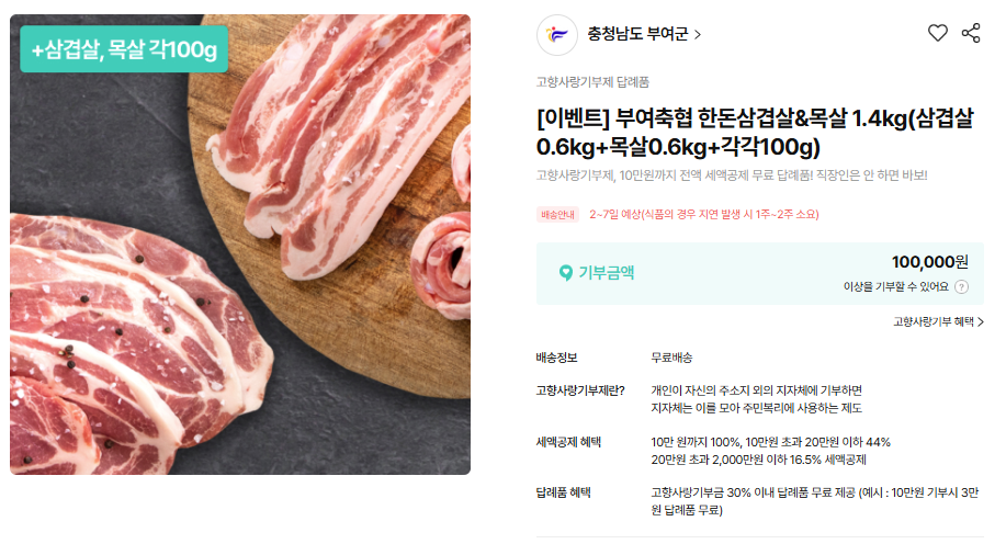 평소처럼 삼겹살을 사 먹는 것과 비슷한 비용을 사용하면서도, 지역을 돕고 추가 혜택까지 받을 수 있다는 점에서 많은 관심을 받고 있는 방식입니다.