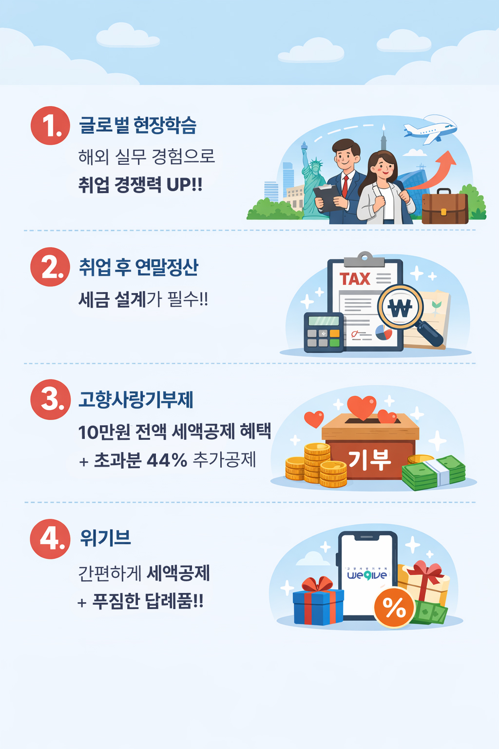 대학생 때는 글로벌 현장학습, 취업 후에는 세액공제 전략, 그리고 그 연결 지점에 고향사랑기부제가 있습니다.