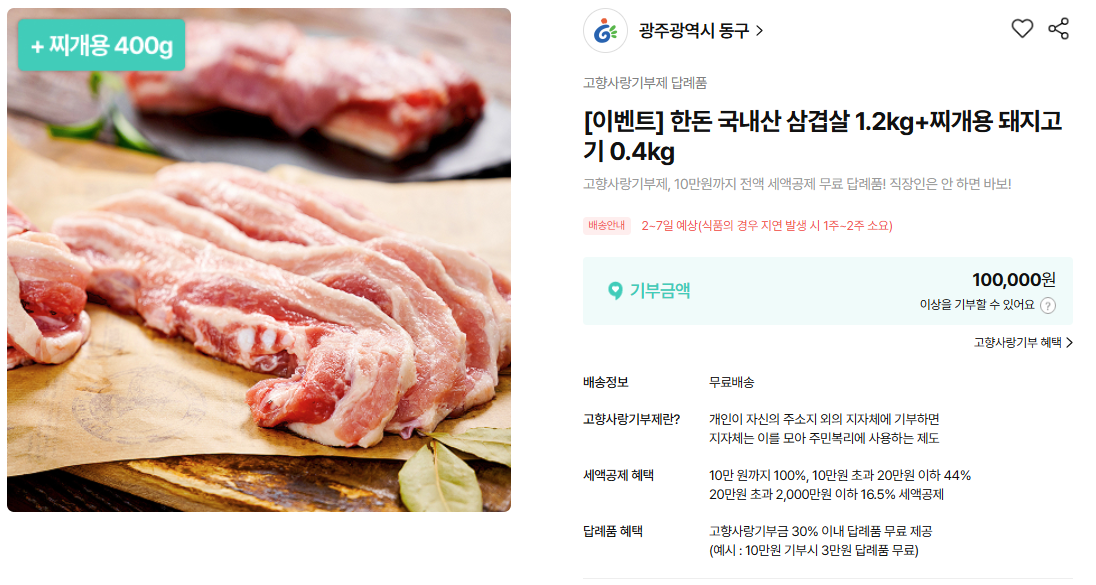 고향사랑기부제 답례품 중에서도 고기는 늘 상위권에 오르는데, 그중 하나가 한돈 국내산 삼겹살 1.2kg + 찌개용 돼지고기 0.4kg 구성입니다.
