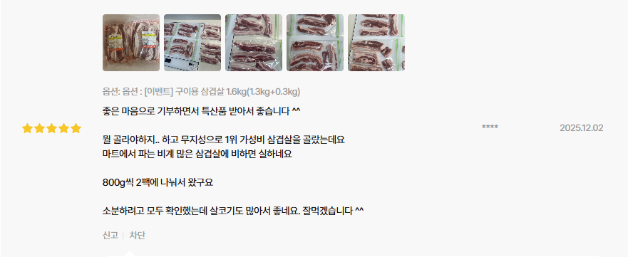 그래서인지 단순히 ‘고기 한 팩’이 아니라, 구이용 + 찌개용, 수육용 등으로 다양하게 먹을 수 있는 실용적인 구성이라는 평가가 이어집니다.