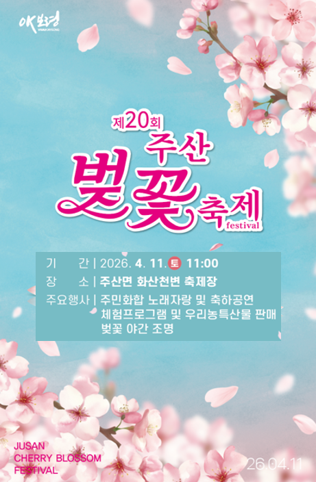 2026년 제20회 주산벚꽃축제는 4월 11일 토요일 10시 30분부터 16시까지 진행됩니다.