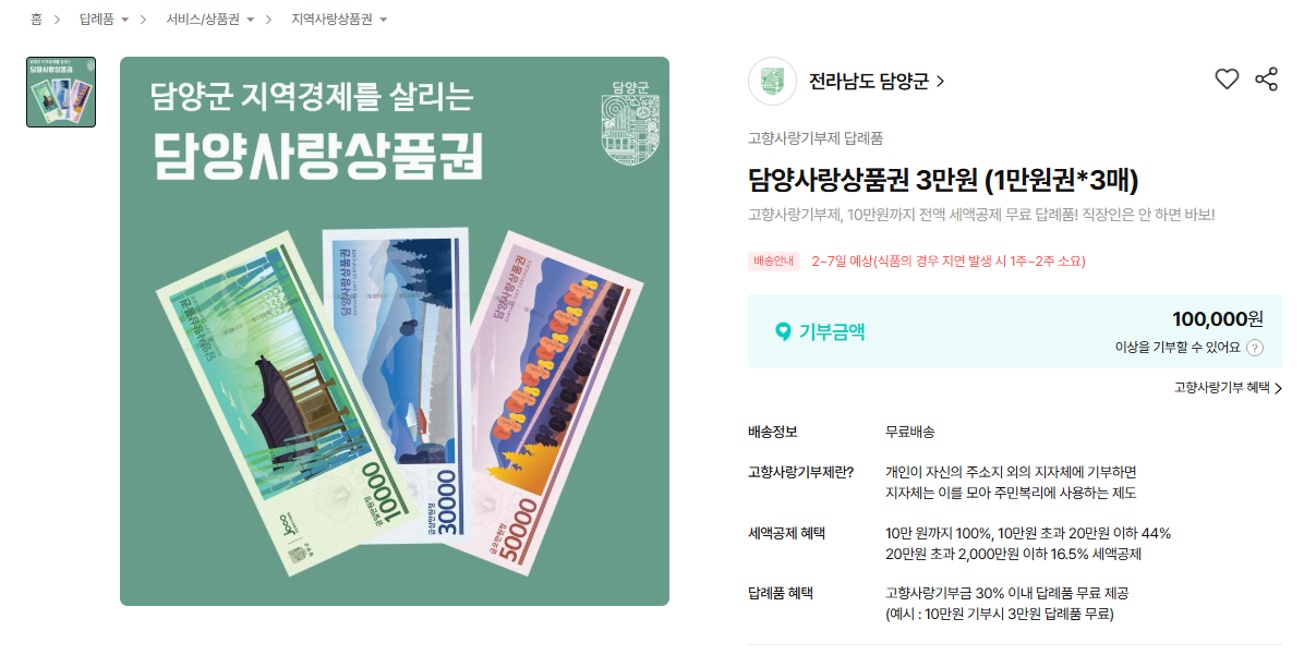 답례품으로 '담양사랑상품권' 선택: 기부금의 30%인 3만 원을 답례품으로 돌려받을 수 있습니다. 이때 답례품으로 '담양사랑상품권(3만 원권)'을 선택해 보세요.