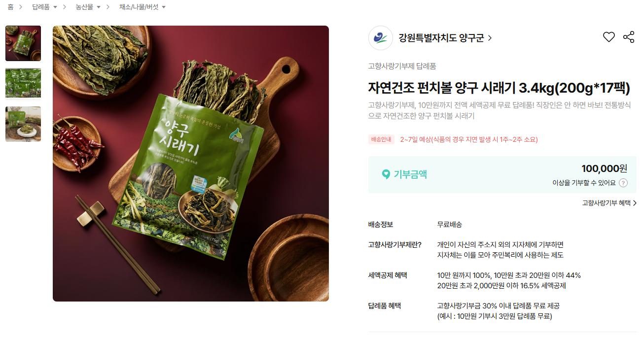 양구군 외 지역에 거주하고 있다면, 양구군에 기부한 뒤 답례품으로 지역 특산물을 선택하는 방식도 가능합니다.