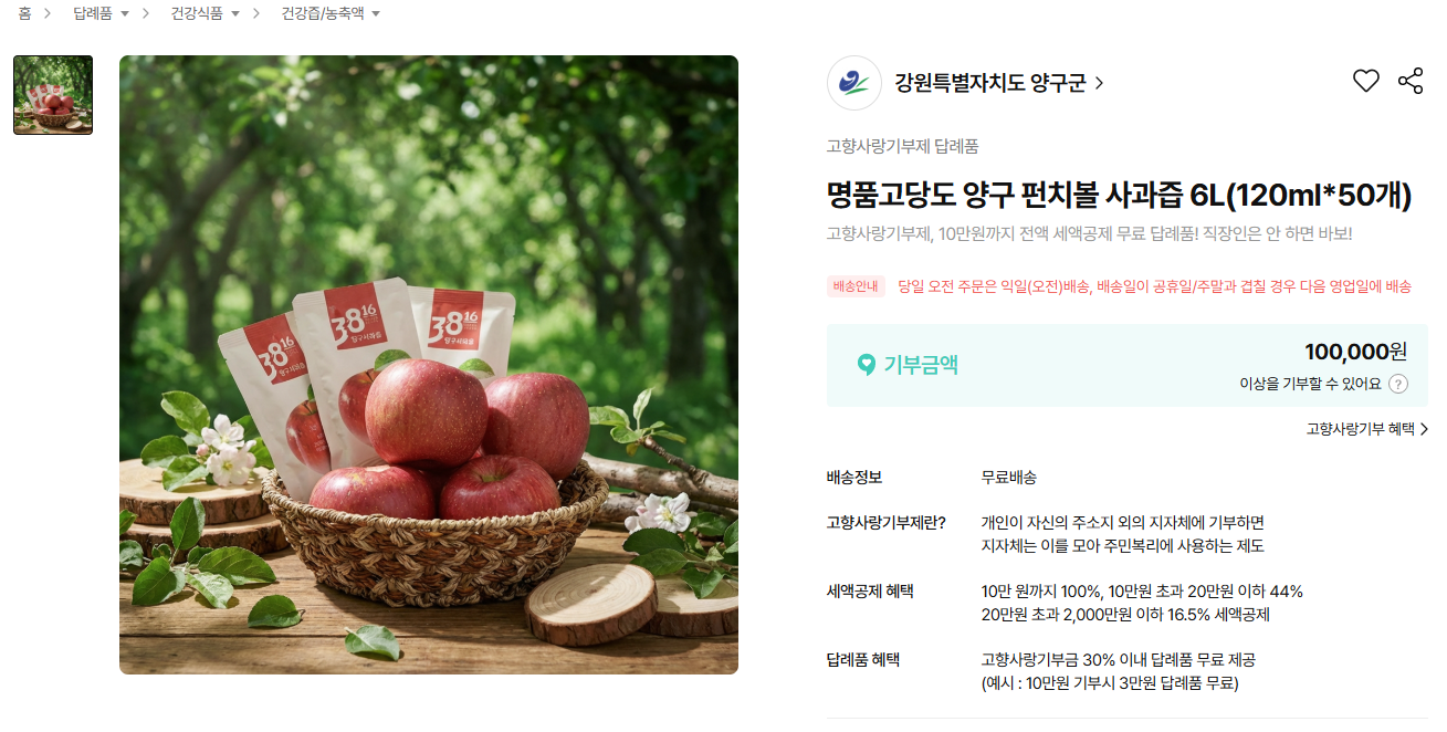 답례품 보러가기-명품고당도 양구 펀치볼 사과즙 6L(120ml*50개)