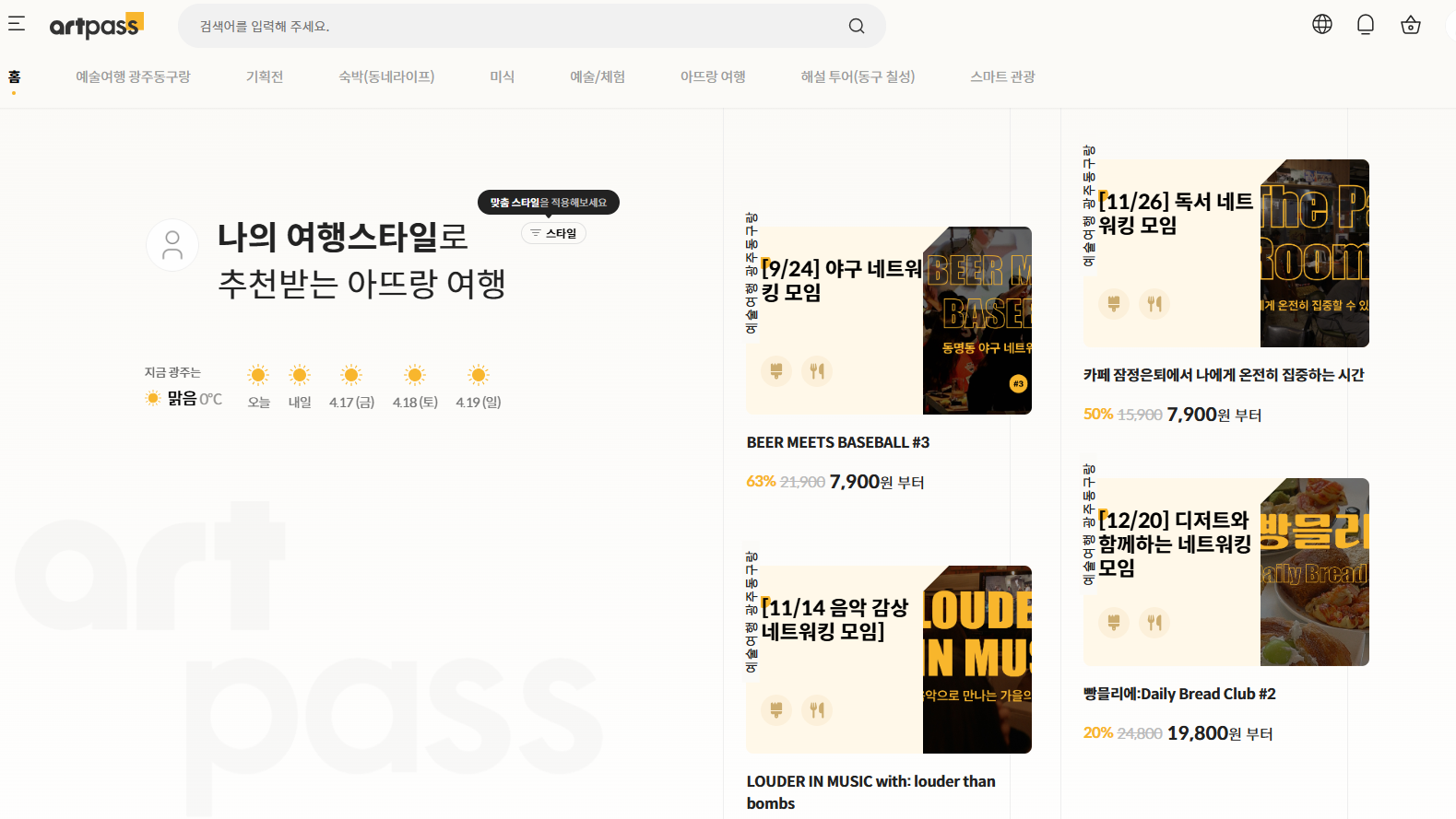 아트패스 하나면 광주 동구의 숨은 로컬 맛집과 핫플 카페의 식음료를 최대 50% 할인된 가격에 즐길 수 있고, 편안한 휴식을 제공할 숙박업소도 최대 30% 할인받을 수 있습니다.