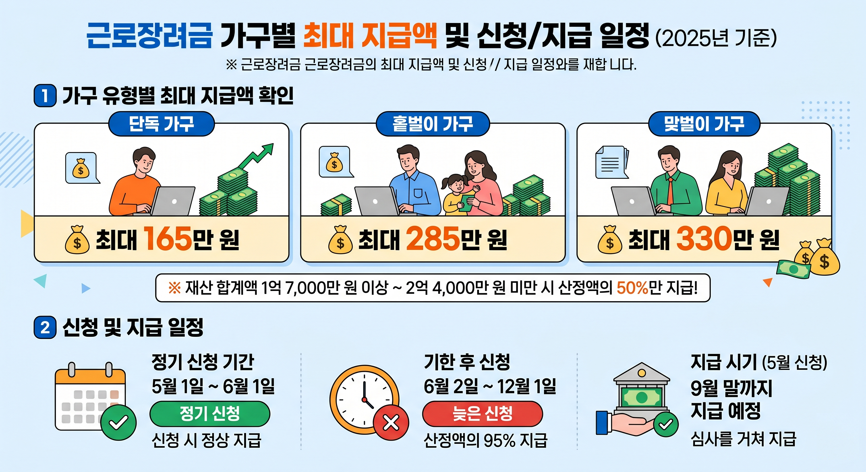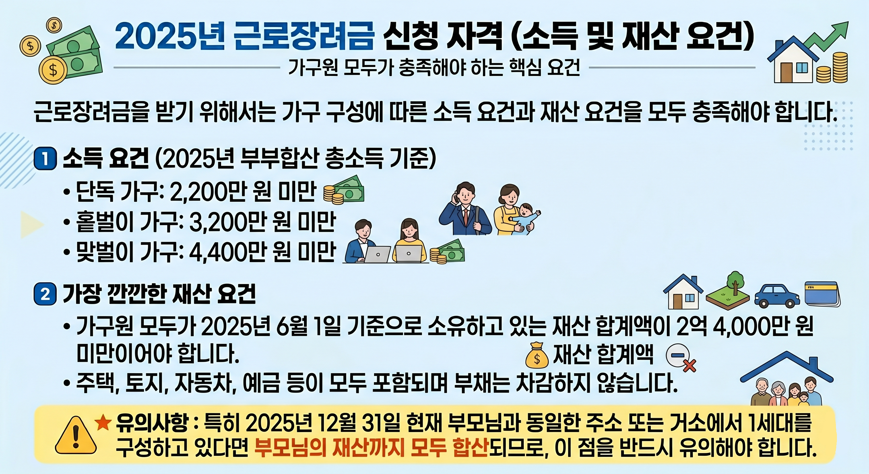 근로장려금을 받기 위해서는 가구 구성에 따른 소득 요건과 재산 요건을 모두 충족해야 합니다.