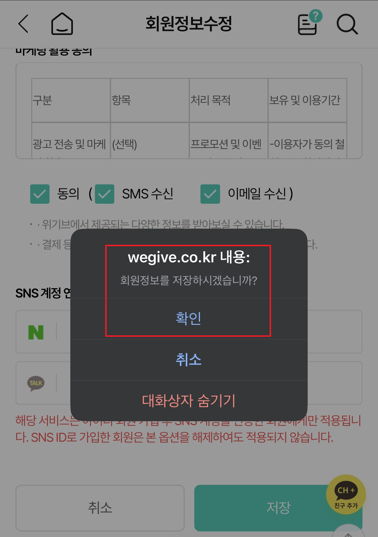 ※ 사이트만 허용하려면: 허용됨 → 추가 → wegive.co.kr 입력