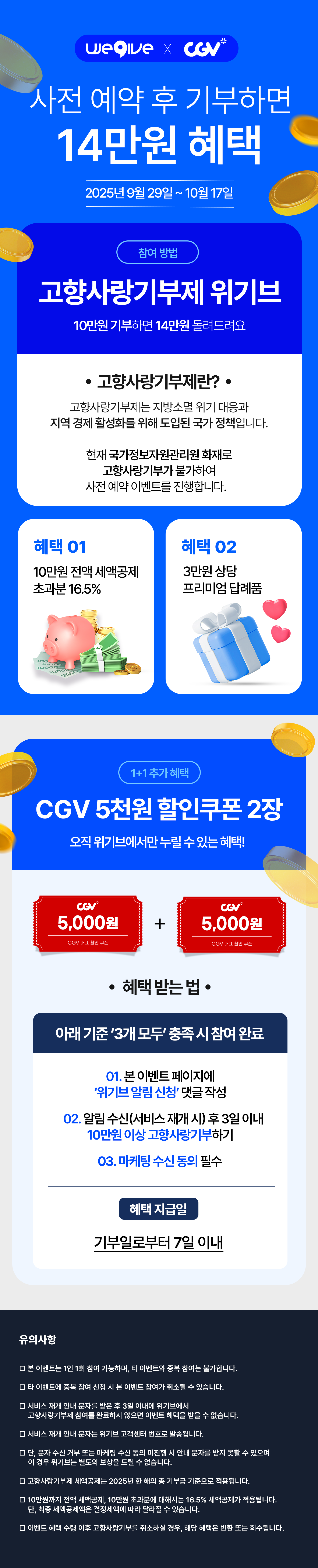 - [위기브XCGV] 고향사랑기부 사전예약하고 5천원 할인권 2장 받자!