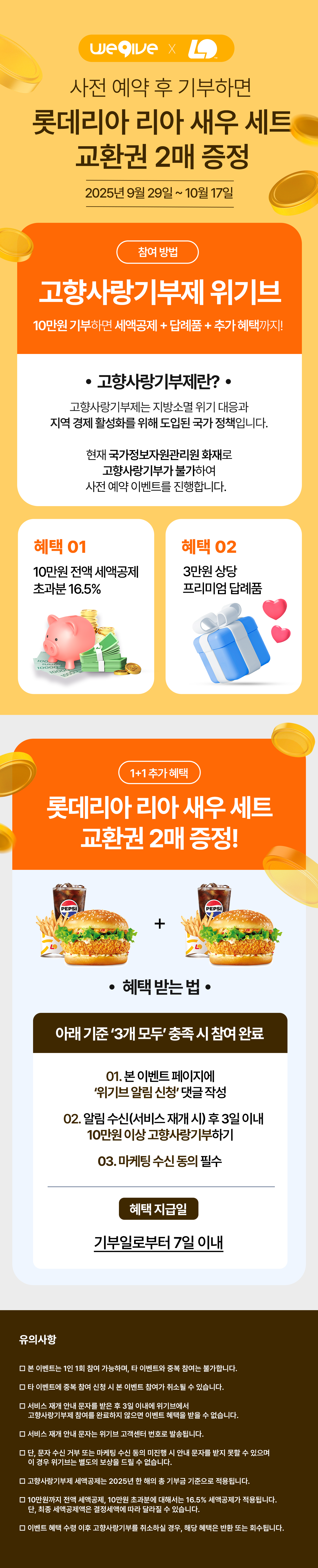 - [롯데리아X위기브] 고향사랑기부하면 리아 새우 세트 공짜!