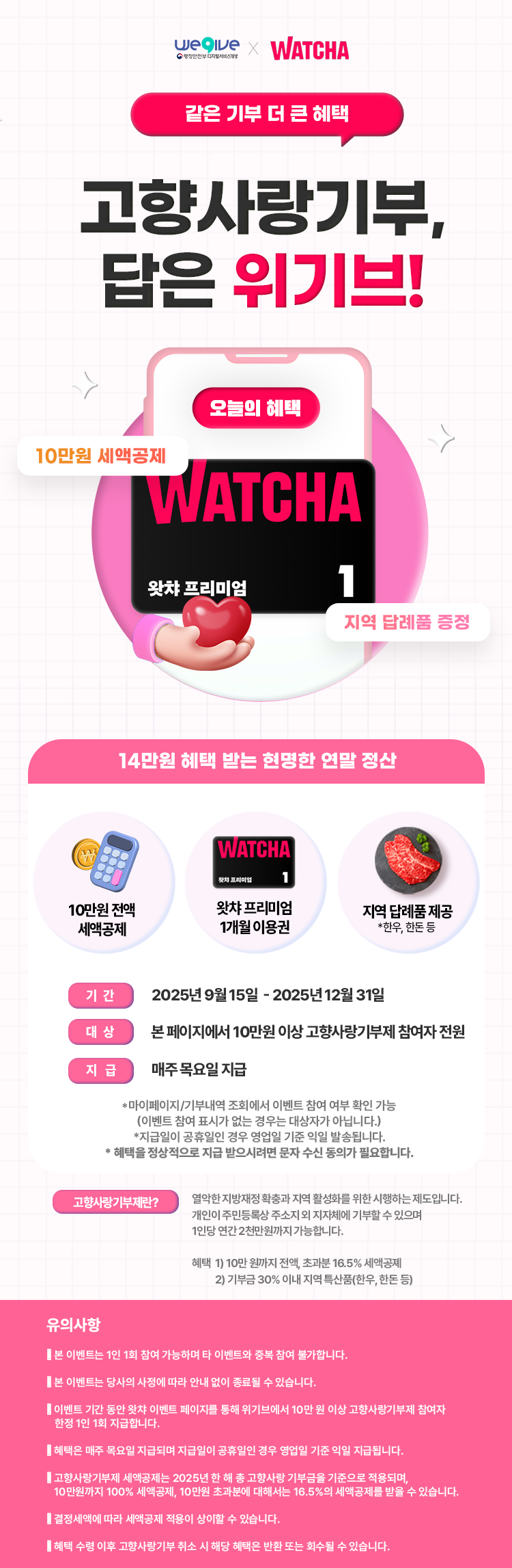 - [위기브X왓챠] 고향사랑기부하면 왓챠 1개월 구독권 증정!