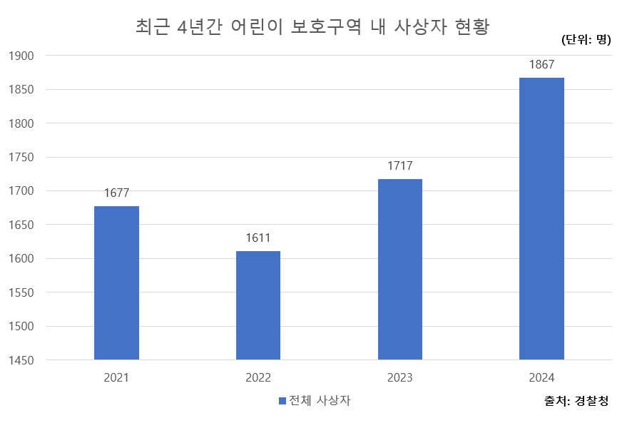 2021년부터 2024년 간 어린이 보호구역 내 교통사고 통계에 따르면, 교통사고를 줄이려는 노력에도 불구하고 매해 사상자 수가 약 100명씩 늘어났습니다.