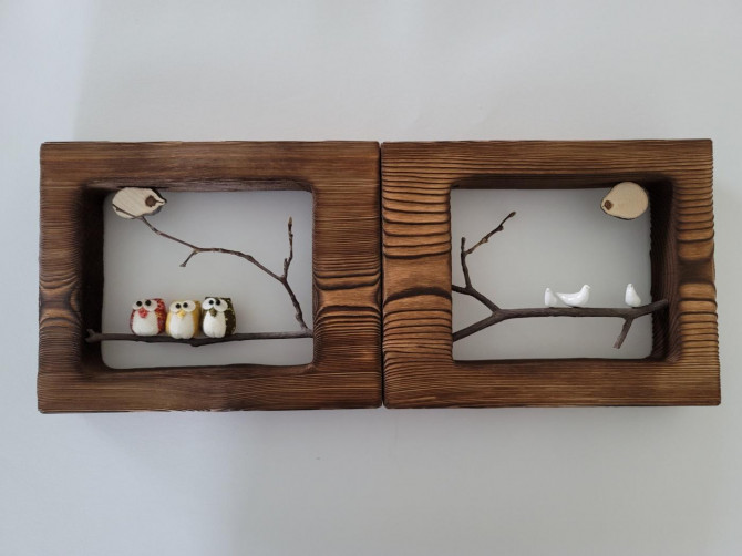 소나무원목에 고재느낌을 표현하고자 낙동기법으로 제작하여 모양이 각기 다른 나무가지위에 새와부엉이를 올려 인테리어용으로 뛰어난 공예문화상품이다.